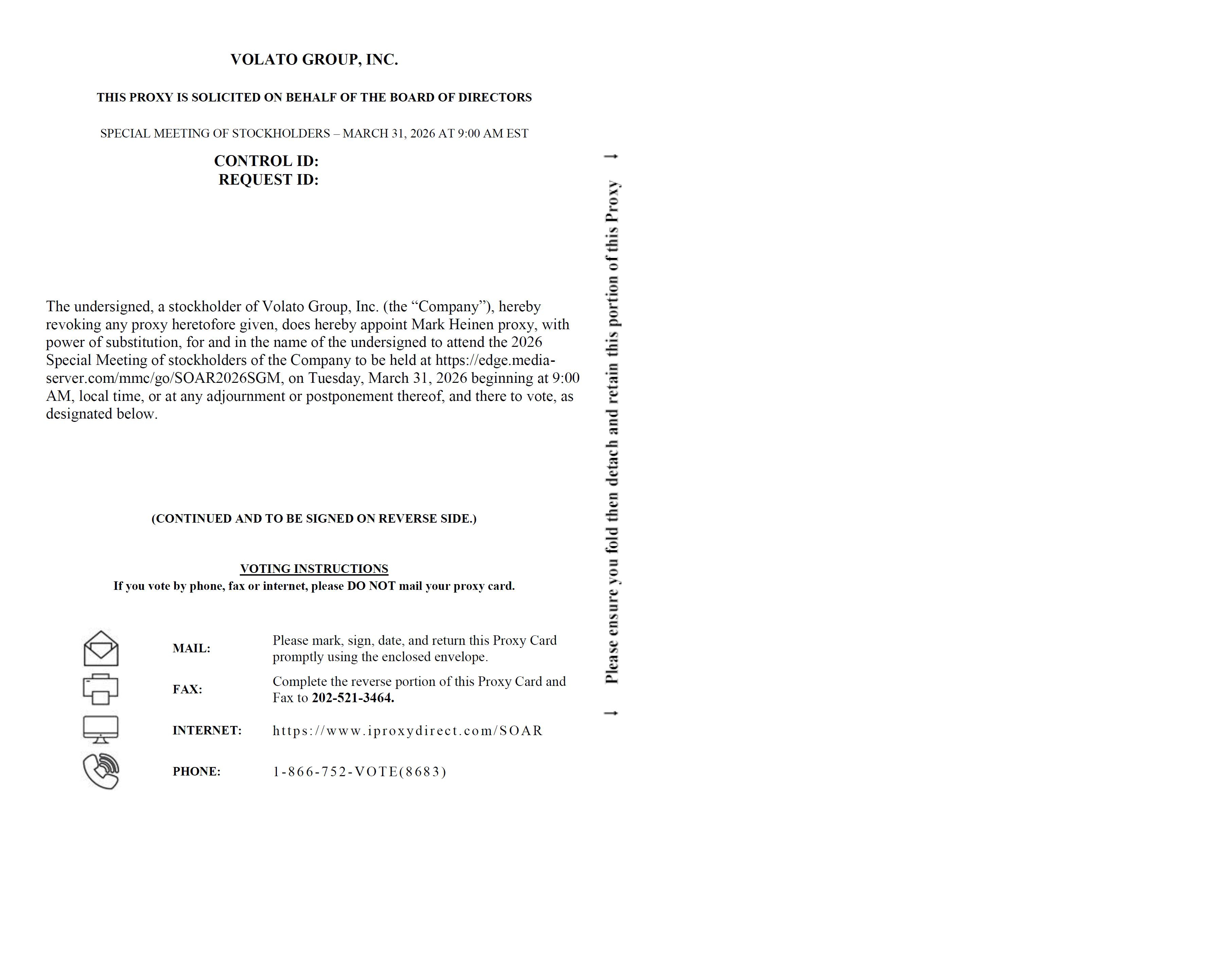 Volato is holding a special meeting of stockholders (the “Special Meeting”) in order to obtain the stockholder approvals necessary to complete the Merger and related matters. The Special Meeting will be held on April 20, 2026, at 9:00 AM Eastern Time, virtually at https://edge.media-server.com/mmc/go/SOAR2026SGM, unless postponed or adjourned to a later date, for the purpose of considering and voting upon the matters set forth in the Notice of Special Meeting of Stockholders and the accompanying proxy statement/prospectus.