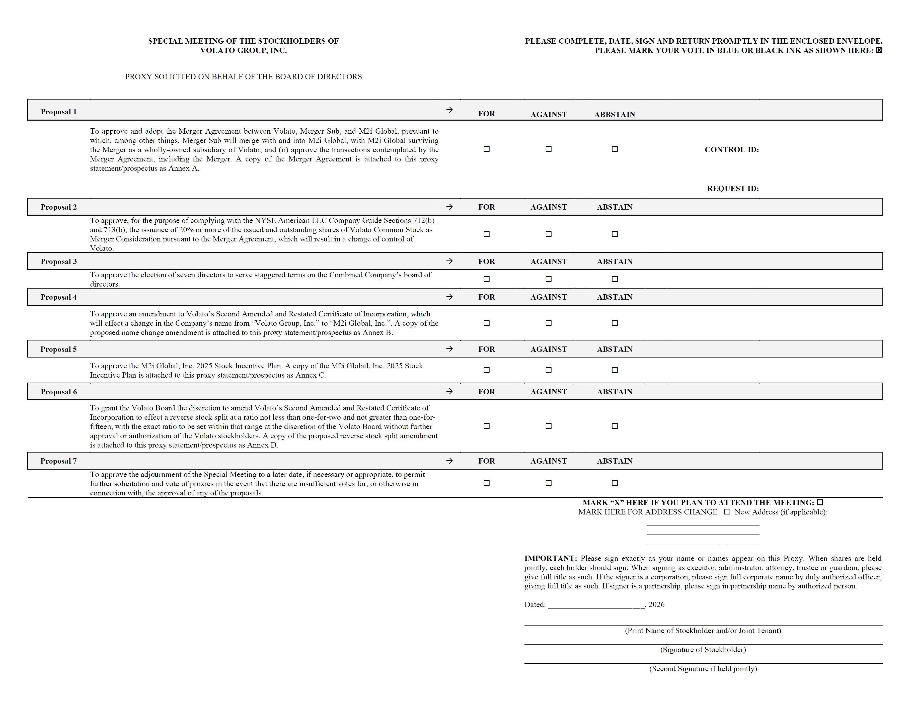 | (iv) | The Name Change Proposal: A proposal to approve an amendment to Volato’s Second Amended and Restated Certificate of Incorporation, which will effect a change in the Company’s name from “Volato Group, Inc.” to “M2i Global, Inc.”. A copy of the proposed name change amendment is attached to this proxy statement/prospectus as Annex B. | |