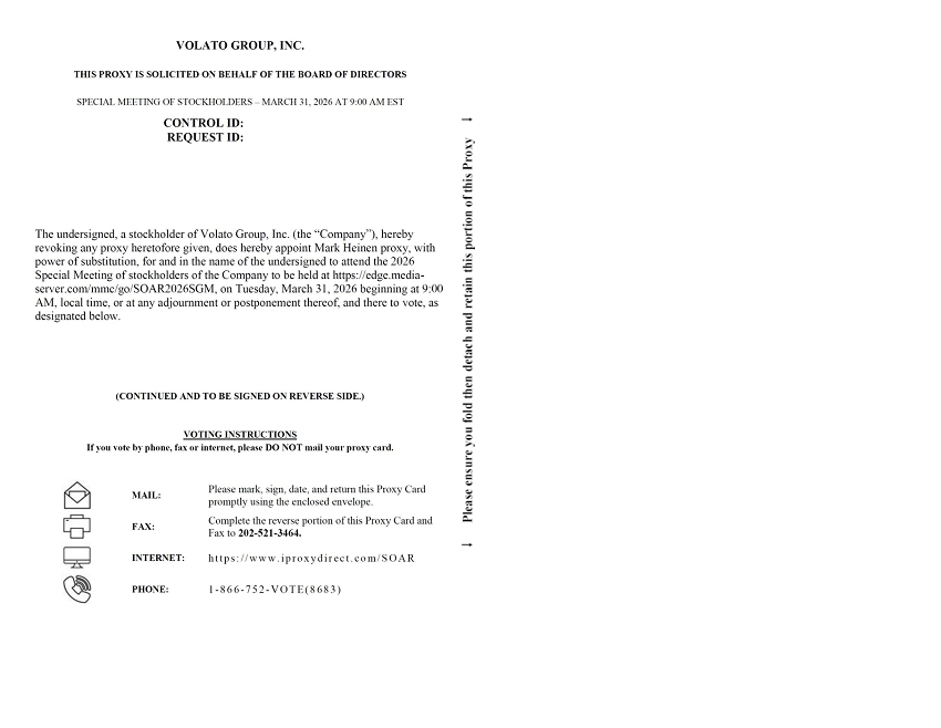 Volato is holding a special meeting of stockholders (the “Special Meeting”) in order to obtain the stockholder approvals necessary to complete the Merger and related matters. The Special Meeting will be held on May 7, 2026, at 9:00 AM Eastern Time, virtually at https://edge.media-server.com/mmc/go/SOAR2026SGM, unless postponed or adjourned to a later date, for the purpose of considering and voting upon the matters set forth in the Notice of Special Meeting of Stockholders and the accompanying proxy statement/prospectus.
