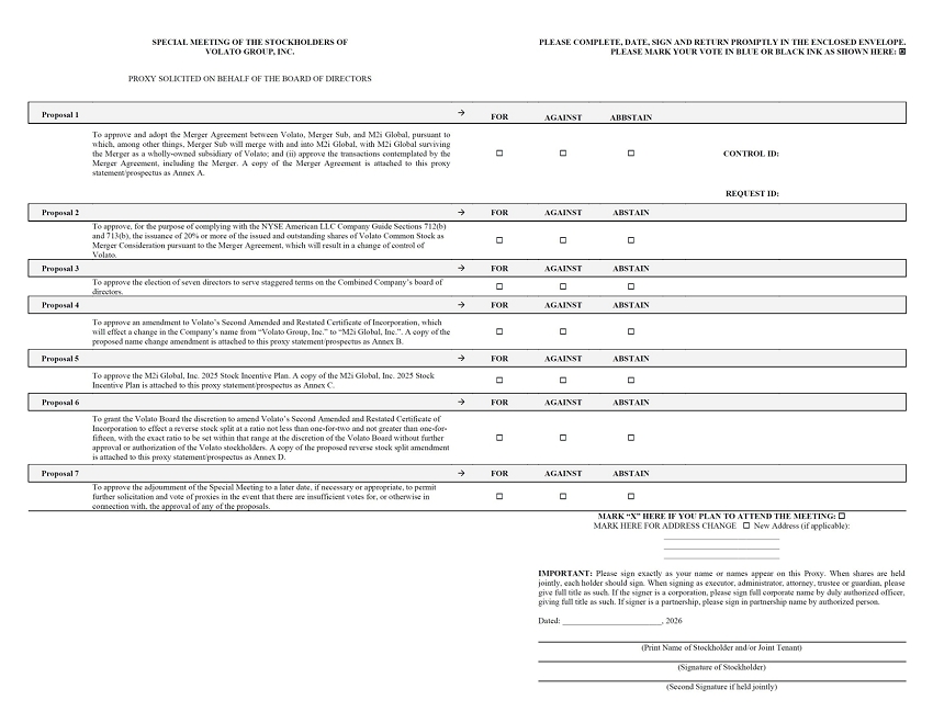 | (iv) | The Name Change Proposal: A proposal to approve an amendment to Volato’s Second Amended and Restated Certificate of Incorporation, which will effect a change in the Company’s name from “Volato Group, Inc.” to “M2i Global, Inc.”. A copy of the proposed name change amendment is attached to this proxy statement/prospectus as Annex B. | |