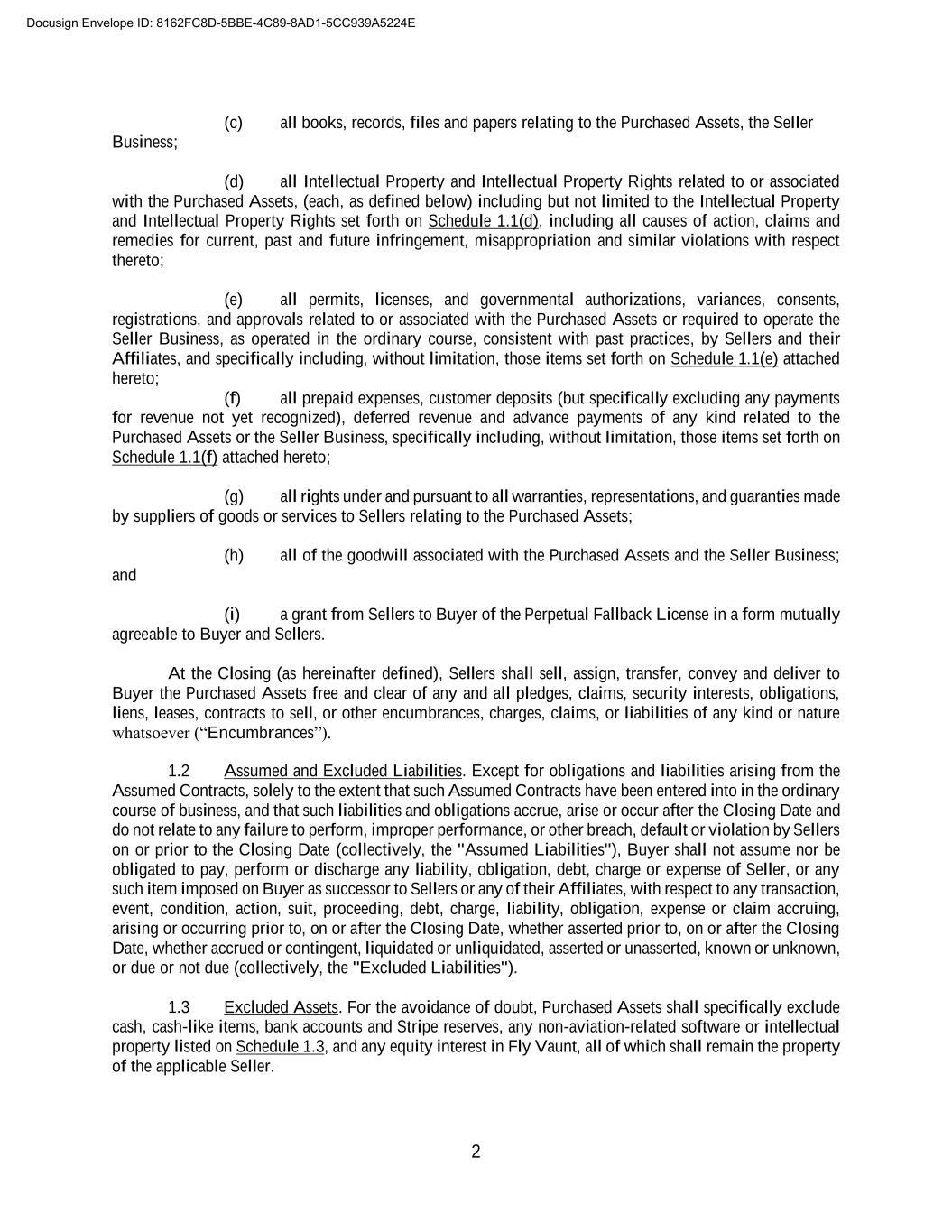 2 (c) all books, records, files and papers relating to the Purchased Assets, the Seller Business; (d) all Intellectual Property and Intellectual Property Rights related to or associated with the Purchased Assets, (each, as defined below) including but not limited to the Intellectual Property and Intellectual Property Rights set forth on Schedule 1.1(d), including all causes of action, claims and remedies for current, past and future infringement, misappropriation and similar violations with respect thereto; (e) all permits, licenses, and governmental authorizations, variances, consents, registrations, and approvals related to or associated with the Purchased Assets or required to operate the Seller Business, as operated in the ordinary course, consistent with past practices, by Sellers and their Affiliates, and specifically including, without limitation, those items set forth on Schedule 1.1(e) attached hereto; (f) all prepaid expenses, customer deposits (but specifically excluding any payments for revenue not yet recognized), deferred revenue and advance payments of any kind related to the Purchased Assets or the Seller Business, specifically including, without limitation, those items set forth on Schedule 1.1(f) attached hereto; (g) all rights under and pursuant to all warranties, representations, and guaranties made by suppliers of goods or services to Sellers relating to the Purchased Assets; (h) all of the goodwill associated with the Purchased Assets and the Seller Business; and (i) a grant from Sellers to Buyer of the Perpetual Fallback License in a form mutually agreeable to Buyer and Sellers. At the Closing (as hereinafter defined), Sellers shall sell, assign, transfer, convey and deliver to Buyer the Purchased Assets free and clear of any and all pledges, claims, security interests, obligations, liens, leases, contracts to sell, or other encumbrances, charges, claims, or liabilities of any kind or nature whatsoever (“Encumbrances”). 1.2 Assumed and Excluded Liabilities. Except for obligations and liabilities arising from the Assumed Contracts, solely to the extent that such Assumed Contracts have been entered into in the ordinary course of business, and that such liabilities and obligations accrue, arise or occur after the Closing Date and do not relate to any failure to perform, improper performance, or other breach, default or violation by Sellers on or prior to the Closing Date (collectively, the "Assumed Liabilities"), Buyer shall not assume nor be obligated to pay, perform or discharge any liability, obligation, debt, charge or expense of Seller, or any such item imposed on Buyer as successor to Sellers or any of their Affiliates, with respect to any transaction, event, condition, action, suit, proceeding, debt, charge, liability, obligation, expense or claim accruing, arising or occurring prior to, on or after the Closing Date, whether asserted prior to, on or after the Closing Date, whether accrued or contingent, liquidated or unliquidated, asserted or unasserted, known or unknown, or due or not due (collectively, the "Excluded Liabilities"). 1.3 Excluded Assets. For the avoidance of doubt, Purchased Assets shall specifically exclude cash, cash-like items, bank accounts and Stripe reserves, any non-aviation-related software or intellectual property listed on Schedule 1.3, and any equity interest in Fly Vaunt, all of which shall remain the property of the applicable Seller. Docusign Envelope ID: 8162FC8D-5BBE-4C89-8AD1-5CC939A5224E