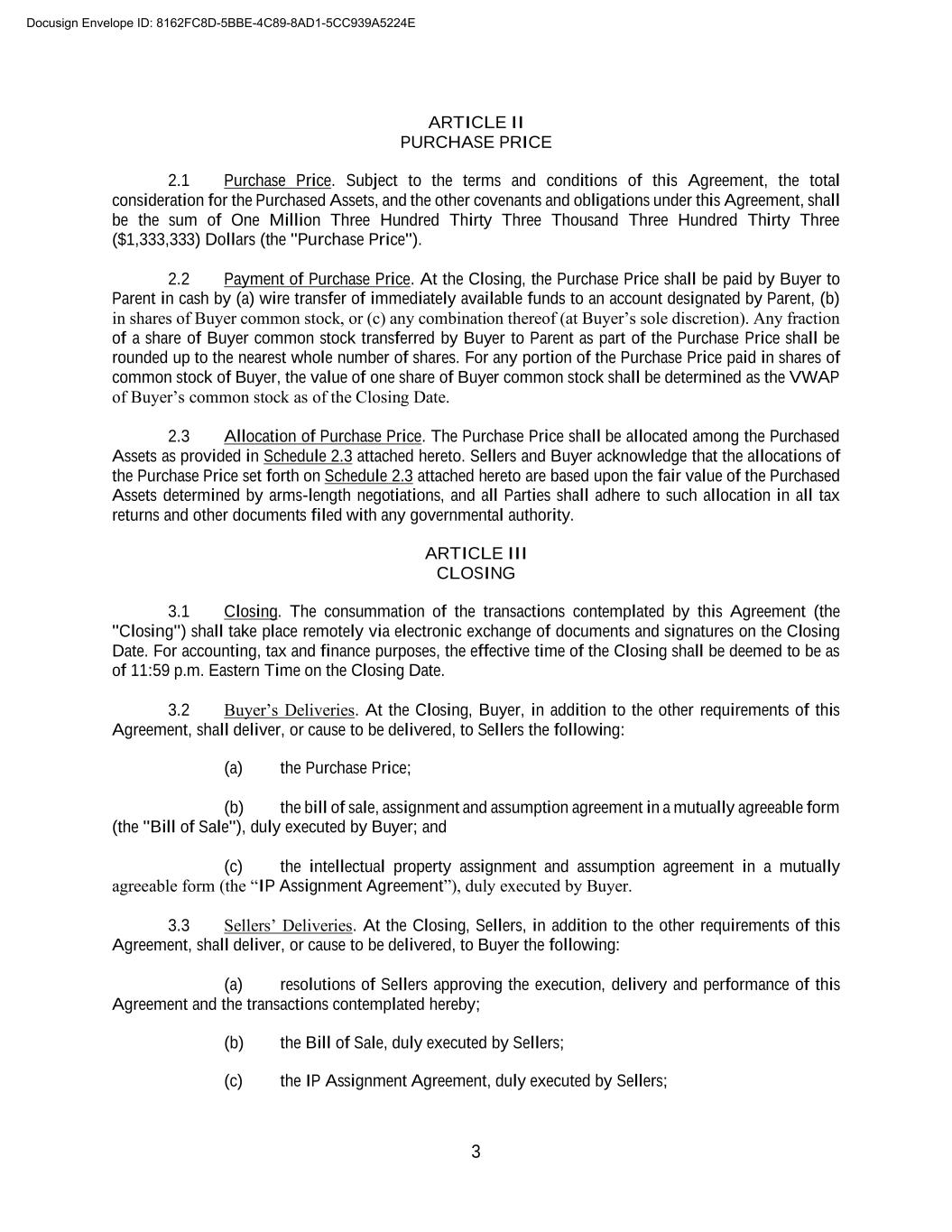 3 ARTICLE II PURCHASE PRICE 2.1 Purchase Price. Subject to the terms and conditions of this Agreement, the total consideration for the Purchased Assets, and the other covenants and obligations under this Agreement, shall be the sum of One Million Three Hundred Thirty Three Thousand Three Hundred Thirty Three ($1,333,333) Dollars (the "Purchase Price"). 2.2 Payment of Purchase Price. At the Closing, the Purchase Price shall be paid by Buyer to Parent in cash by (a) wire transfer of immediately available funds to an account designated by Parent, (b) in shares of Buyer common stock, or (c) any combination thereof (at Buyer’s sole discretion). Any fraction of a share of Buyer common stock transferred by Buyer to Parent as part of the Purchase Price shall be rounded up to the nearest whole number of shares. For any portion of the Purchase Price paid in shares of common stock of Buyer, the value of one share of Buyer common stock shall be determined as the VWAP of Buyer’s common stock as of the Closing Date. 2.3 Allocation of Purchase Price. The Purchase Price shall be allocated among the Purchased Assets as provided in Schedule 2.3 attached hereto. Sellers and Buyer acknowledge that the allocations of the Purchase Price set forth on Schedule 2.3 attached hereto are based upon the fair value of the Purchased Assets determined by arms-length negotiations, and all Parties shall adhere to such allocation in all tax returns and other documents filed with any governmental authority. ARTICLE III CLOSING 3.1 Closing. The consummation of the transactions contemplated by this Agreement (the "Closing") shall take place remotely via electronic exchange of documents and signatures on the Closing Date. For accounting, tax and finance purposes, the effective time of the Closing shall be deemed to be as of 11:59 p.m. Eastern Time on the Closing Date. 3.2 Buyer’s Deliveries. At the Closing, Buyer, in addition to the other requirements of this Agreement, shall deliver, or cause to be delivered, to Sellers the following: (a) the Purchase Price; (b) the bill of sale, assignment and assumption agreement in a mutually agreeable form (the "Bill of Sale"), duly executed by Buyer; and (c) the intellectual property assignment and assumption agreement in a mutually agreeable form (the “IP Assignment Agreement”), duly executed by Buyer. 3.3 Sellers’ Deliveries. At the Closing, Sellers, in addition to the other requirements of this Agreement, shall deliver, or cause to be delivered, to Buyer the following: (a) resolutions of Sellers approving the execution, delivery and performance of this Agreement and the transactions contemplated hereby; (b) the Bill of Sale, duly executed by Sellers; (c) the IP Assignment Agreement, duly executed by Sellers; Docusign Envelope ID: 8162FC8D-5BBE-4C89-8AD1-5CC939A5224E