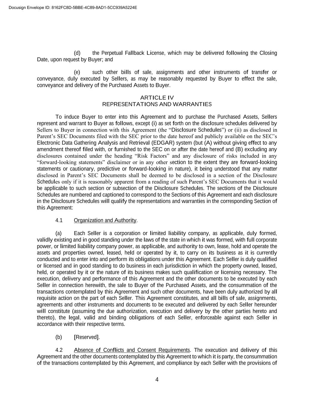 4 (d) the Perpetual Fallback License, which may be delivered following the Closing Date, upon request by Buyer; and (e) such other bills of sale, assignments and other instruments of transfer or conveyance, duly executed by Sellers, as may be reasonably requested by Buyer to effect the sale, conveyance and delivery of the Purchased Assets to Buyer. ARTICLE IV REPRESENTATIONS AND WARRANTIES To induce Buyer to enter into this Agreement and to purchase the Purchased Assets, Sellers represent and warrant to Buyer as follows, except (i) as set forth on the disclosure schedules delivered by Sellers to Buyer in connection with this Agreement (the “Disclosure Schedules”) or (ii) as disclosed in Parent’s SEC Documents filed with the SEC prior to the date hereof and publicly available on the SEC’s Electronic Data Gathering Analysis and Retrieval (EDGAR) system (but (A) without giving effect to any amendment thereof filed with, or furnished to the SEC on or after the date hereof and (B) excluding any disclosures contained under the heading “Risk Factors” and any disclosure of risks included in any “forward-looking statements” disclaimer or in any other section to the extent they are forward-looking statements or cautionary, predictive or forward-looking in nature), it being understood that any matter disclosed in Parent’s SEC Documents shall be deemed to be disclosed in a section of the Disclosure Schedules only if it is reasonably apparent from a reading of such Parent’s SEC Documents that it would be applicable to such section or subsection of the Disclosure Schedules. The sections of the Disclosure Schedules are numbered and captioned to correspond to the Sections of this Agreement and each disclosure in the Disclosure Schedules will qualify the representations and warranties in the corresponding Section of this Agreement: 4.1 Organization and Authority. (a) Each Seller is a corporation or limited liability company, as applicable, duly formed, validly existing and in good standing under the laws of the state in which it was formed, with full corporate power, or limited liability company power, as applicable, and authority to own, lease, hold and operate the assets and properties owned, leased, held or operated by it, to carry on its business as it is currently conducted and to enter into and perform its obligations under this Agreement. Each Seller is duly qualified or licensed and in good standing to do business in each jurisdiction in which the property owned, leased, held, or operated by it or the nature of its business makes such qualification or licensing necessary. The execution, delivery and performance of this Agreement and the other documents to be executed by each Seller in connection herewith, the sale to Buyer of the Purchased Assets, and the consummation of the transactions contemplated by this Agreement and such other documents, have been duly authorized by all requisite action on the part of each Seller. This Agreement constitutes, and all bills of sale, assignments, agreements and other instruments and documents to be executed and delivered by each Seller hereunder will constitute (assuming the due authorization, execution and delivery by the other parties hereto and thereto), the legal, valid and binding obligations of each Seller, enforceable against each Seller in accordance with their respective terms. (b) [Reserved]. 4.2 Absence of Conflicts and Consent Requirements. The execution and delivery of this Agreement and the other documents contemplated by this Agreement to which it is party, the consummation of the transactions contemplated by this Agreement, and compliance by each Seller with the provisions of Docusign Envelope ID: 8162FC8D-5BBE-4C89-8AD1-5CC939A5224E