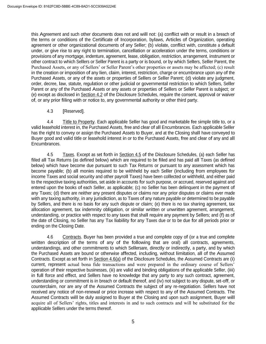 5 this Agreement and such other documents does not and will not: (a) conflict with or result in a breach of the terms or conditions of the Certificate of Incorporation, bylaws, Articles of Organization, operating agreement or other organizational documents of any Seller; (b) violate, conflict with, constitute a default under, or give rise to any right to termination, cancellation or acceleration under the terms, conditions or provisions of any mortgage, indenture, agreement, lease, obligation, restriction, arrangement, instrument or other contract to which Sellers or Seller Parent is a party or is bound, or by which Sellers, Seller Parent, the Purchased Assets, or any of Sellers’ or Seller Parent’s other properties or assets may be affected; (c) result in the creation or imposition of any lien, claim, interest, restriction, charge or encumbrance upon any of the Purchased Assets, or any of the assets or properties of Sellers or Seller Parent; (d) violate any judgment, order, decree, law, statute, regulation or other judicial or governmental restriction to which Sellers, Seller Parent or any of the Purchased Assets or any assets or properties of Sellers or Seller Parent is subject; or (e) except as disclosed in Section 4.2 of the Disclosure Schedules, require the consent, approval or waiver of, or any prior filing with or notice to, any governmental authority or other third party. 4.3 [Reserved]. 4.4 Title to Property. Each applicable Seller has good and marketable fee simple title to, or a valid leasehold interest in, the Purchased Assets, free and clear of all Encumbrances. Each applicable Seller has the right to convey or assign the Purchased Assets to Buyer, and at the Closing shall have conveyed to Buyer good and valid title or leasehold interest in or to the Purchased Assets, free and clear of any and all Encumbrances. 4.5 Taxes. Except as set forth in Section 4.5 of the Disclosure Schedules, (a) each Seller has filed all Tax Returns (as defined below) which are required to be filed and has paid all Taxes (as defined below) which have become due pursuant to such Tax Returns or pursuant to any assessment which has become payable; (b) all monies required to be withheld by each Seller (including from employees for income Taxes and social security and other payroll Taxes) have been collected or withheld, and either paid to the respective taxing authorities, set aside in accounts for such purpose, or accrued, reserved against and entered upon the books of each Seller, as applicable; (c) no Seller has been delinquent in the payment of any Taxes; (d) there are neither any present disputes or claims nor any prior disputes or claims ever made with any taxing authority, in any jurisdiction, as to Taxes of any nature payable or determined to be payable by Sellers, and there is no basis for any such dispute or claim; (e) there is no tax sharing agreement, tax allocation agreement, tax indemnity obligation, or similar written or unwritten agreement, arrangement, understanding, or practice with respect to any taxes that shall require any payment by Sellers; and (f) as of the date of Closing, no Seller has any Tax liability for any Taxes due or to be due for all periods prior or ending on the Closing Date. 4.6 Contracts. Buyer has been provided a true and complete copy of (or a true and complete written description of the terms of any of the following that are oral) all contracts, agreements, understandings, and other commitments to which Sellersare, directly or indirectly, a party, and by which the Purchased Assets are bound or otherwise affected, including, without limitation, all of the Assumed Contracts. Except as set forth in Section 4.6(a) of the Disclosure Schedules, the Assumed Contracts are (i) current, represent actual bona fide transactions and were prepared in the ordinary course of Sellers’ operation of their respective businesses, (ii) are valid and binding obligations of the applicable Seller, (iii) in full force and effect, and Sellers have no knowledge that any party to any such contract, agreement, understanding or commitment is in breach or default thereof, and (iv) not subject to any dispute, set-off, or counterclaim, nor are any of the Assumed Contracts the subject of any re-negotiation. Sellers have not received any notice of non-renewal or price increase with respect to any of the Assumed Contracts. The Assumed Contracts will be duly assigned to Buyer at the Closing and upon such assignment, Buyer will acquire all of Sellers’ rights, titles and interests in and to such contracts and will be substituted for the applicable Sellers under the terms thereof. Docusign Envelope ID: 8162FC8D-5BBE-4C89-8AD1-5CC939A5224E