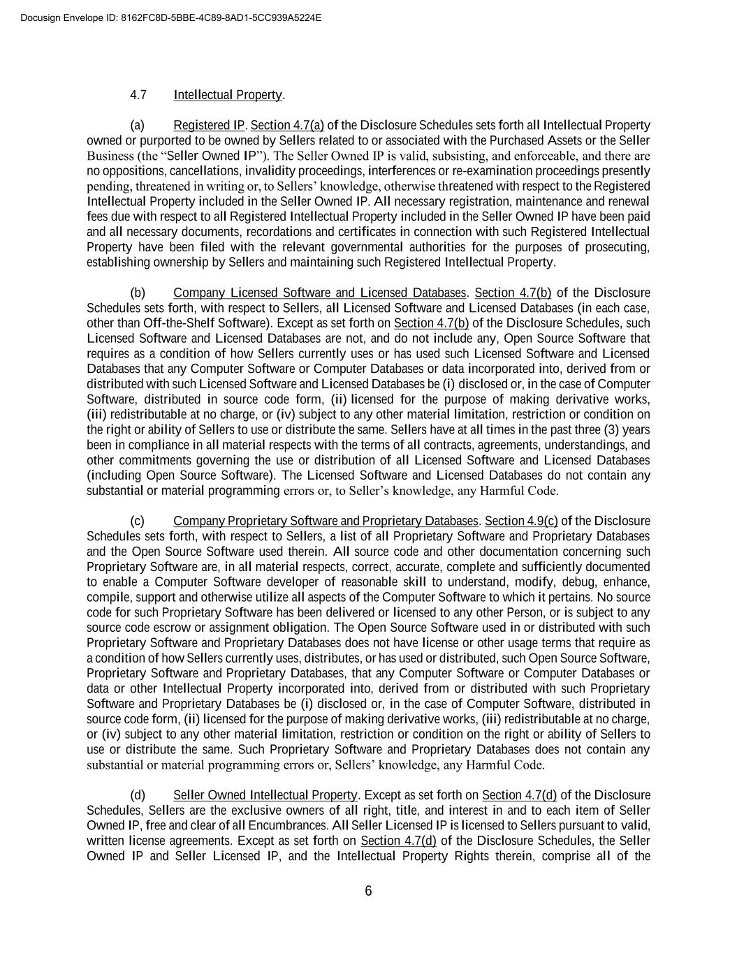 6 4.7 Intellectual Property. (a) Registered IP. Section 4.7(a) of the Disclosure Schedules sets forth all Intellectual Property owned or purported to be owned by Sellers related to or associated with the Purchased Assets or the Seller Business (the “Seller Owned IP”). The Seller Owned IP is valid, subsisting, and enforceable, and there are no oppositions, cancellations, invalidity proceedings, interferences or re-examination proceedings presently pending, threatened in writing or, to Sellers’ knowledge, otherwise threatened with respect to the Registered Intellectual Property included in the Seller Owned IP. All necessary registration, maintenance and renewal fees due with respect to all Registered Intellectual Property included in the Seller Owned IP have been paid and all necessary documents, recordations and certificates in connection with such Registered Intellectual Property have been filed with the relevant governmental authorities for the purposes of prosecuting, establishing ownership by Sellers and maintaining such Registered Intellectual Property. (b) Company Licensed Software and Licensed Databases. Section 4.7(b) of the Disclosure Schedules sets forth, with respect to Sellers, all Licensed Software and Licensed Databases (in each case, other than Off-the-Shelf Software). Except as set forth on Section 4.7(b) of the Disclosure Schedules, such Licensed Software and Licensed Databases are not, and do not include any, Open Source Software that requires as a condition of how Sellers currently uses or has used such Licensed Software and Licensed Databases that any Computer Software or Computer Databases or data incorporated into, derived from or distributed with such Licensed Software and Licensed Databases be (i) disclosed or, in the case of Computer Software, distributed in source code form, (ii) licensed for the purpose of making derivative works, (iii) redistributable at no charge, or (iv) subject to any other material limitation, restriction or condition on the right or ability of Sellers to use or distribute the same. Sellers have at all times in the past three (3) years been in compliance in all material respects with the terms of all contracts, agreements, understandings, and other commitments governing the use or distribution of all Licensed Software and Licensed Databases (including Open Source Software). The Licensed Software and Licensed Databases do not contain any substantial or material programming errors or, to Seller’s knowledge, any Harmful Code. (c) Company Proprietary Software and Proprietary Databases. Section 4.9(c) of the Disclosure Schedules sets forth, with respect to Sellers, a list of all Proprietary Software and Proprietary Databases and the Open Source Software used therein. All source code and other documentation concerning such Proprietary Software are, in all material respects, correct, accurate, complete and sufficiently documented to enable a Computer Software developer of reasonable skill to understand, modify, debug, enhance, compile, support and otherwise utilize all aspects of the Computer Software to which it pertains. No source code for such Proprietary Software has been delivered or licensed to any other Person, or is subject to any source code escrow or assignment obligation. The Open Source Software used in or distributed with such Proprietary Software and Proprietary Databases does not have license or other usage terms that require as a condition of how Sellers currently uses, distributes, or has used or distributed, such Open Source Software, Proprietary Software and Proprietary Databases, that any Computer Software or Computer Databases or data or other Intellectual Property incorporated into, derived from or distributed with such Proprietary Software and Proprietary Databases be (i) disclosed or, in the case of Computer Software, distributed in source code form, (ii) licensed for the purpose of making derivative works, (iii) redistributable at no charge, or (iv) subject to any other material limitation, restriction or condition on the right or ability of Sellers to use or distribute the same. Such Proprietary Software and Proprietary Databases does not contain any substantial or material programming errors or, Sellers’ knowledge, any Harmful Code. (d) Seller Owned Intellectual Property. Except as set forth on Section 4.7(d) of the Disclosure Schedules, Sellers are the exclusive owners of all right, title, and interest in and to each item of Seller Owned IP, free and clear of all Encumbrances. All Seller Licensed IP is licensed to Sellers pursuant to valid, written license agreements. Except as set forth on Section 4.7(d) of the Disclosure Schedules, the Seller Owned IP and Seller Licensed IP, and the Intellectual Property Rights therein, comprise all of the Docusign Envelope ID: 8162FC8D-5BBE-4C89-8AD1-5CC939A5224E