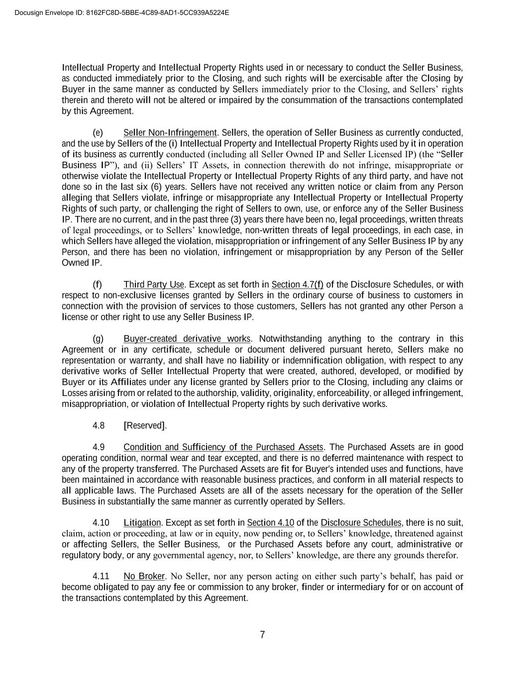 7 Intellectual Property and Intellectual Property Rights used in or necessary to conduct the Seller Business, as conducted immediately prior to the Closing, and such rights will be exercisable after the Closing by Buyer in the same manner as conducted by Sellers immediately prior to the Closing, and Sellers’ rights therein and thereto will not be altered or impaired by the consummation of the transactions contemplated by this Agreement. (e) Seller Non-Infringement. Sellers, the operation of Seller Business as currently conducted, and the use by Sellers of the (i) Intellectual Property and Intellectual Property Rights used by it in operation of its business as currently conducted (including all Seller Owned IP and Seller Licensed IP) (the “Seller Business IP”), and (ii) Sellers’ IT Assets, in connection therewith do not infringe, misappropriate or otherwise violate the Intellectual Property or Intellectual Property Rights of any third party, and have not done so in the last six (6) years. Sellers have not received any written notice or claim from any Person alleging that Sellers violate, infringe or misappropriate any Intellectual Property or Intellectual Property Rights of such party, or challenging the right of Sellers to own, use, or enforce any of the Seller Business IP. There are no current, and in the past three (3) years there have been no, legal proceedings, written threats of legal proceedings, or to Sellers’ knowledge, non-written threats of legal proceedings, in each case, in which Sellers have alleged the violation, misappropriation or infringement of any Seller Business IP by any Person, and there has been no violation, infringement or misappropriation by any Person of the Seller Owned IP. (f) Third Party Use. Except as set forth in Section 4.7(f) of the Disclosure Schedules, or with respect to non-exclusive licenses granted by Sellers in the ordinary course of business to customers in connection with the provision of services to those customers, Sellers has not granted any other Person a license or other right to use any Seller Business IP. (g) Buyer-created derivative works. Notwithstanding anything to the contrary in this Agreement or in any certificate, schedule or document delivered pursuant hereto, Sellers make no representation or warranty, and shall have no liability or indemnification obligation, with respect to any derivative works of Seller Intellectual Property that were created, authored, developed, or modified by Buyer or its Affiliates under any license granted by Sellers prior to the Closing, including any claims or Losses arising from or related to the authorship, validity, originality, enforceability, or alleged infringement, misappropriation, or violation of Intellectual Property rights by such derivative works. 4.8 [Reserved]. 4.9 Condition and Sufficiency of the Purchased Assets. The Purchased Assets are in good operating condition, normal wear and tear excepted, and there is no deferred maintenance with respect to any of the property transferred. The Purchased Assets are fit for Buyer's intended uses and functions, have been maintained in accordance with reasonable business practices, and conform in all material respects to all applicable laws. The Purchased Assets are all of the assets necessary for the operation of the Seller Business in substantially the same manner as currently operated by Sellers. 4.10 Litigation. Except as set forth in Section 4.10 of the Disclosure Schedules, there is no suit, claim, action or proceeding, at law or in equity, now pending or, to Sellers’ knowledge, threatened against or affecting Sellers, the Seller Business, or the Purchased Assets before any court, administrative or regulatory body, or any governmental agency, nor, to Sellers’ knowledge, are there any grounds therefor. 4.11 No Broker. No Seller, nor any person acting on either such party’s behalf, has paid or become obligated to pay any fee or commission to any broker, finder or intermediary for or on account of the transactions contemplated by this Agreement. Docusign Envelope ID: 8162FC8D-5BBE-4C89-8AD1-5CC939A5224E