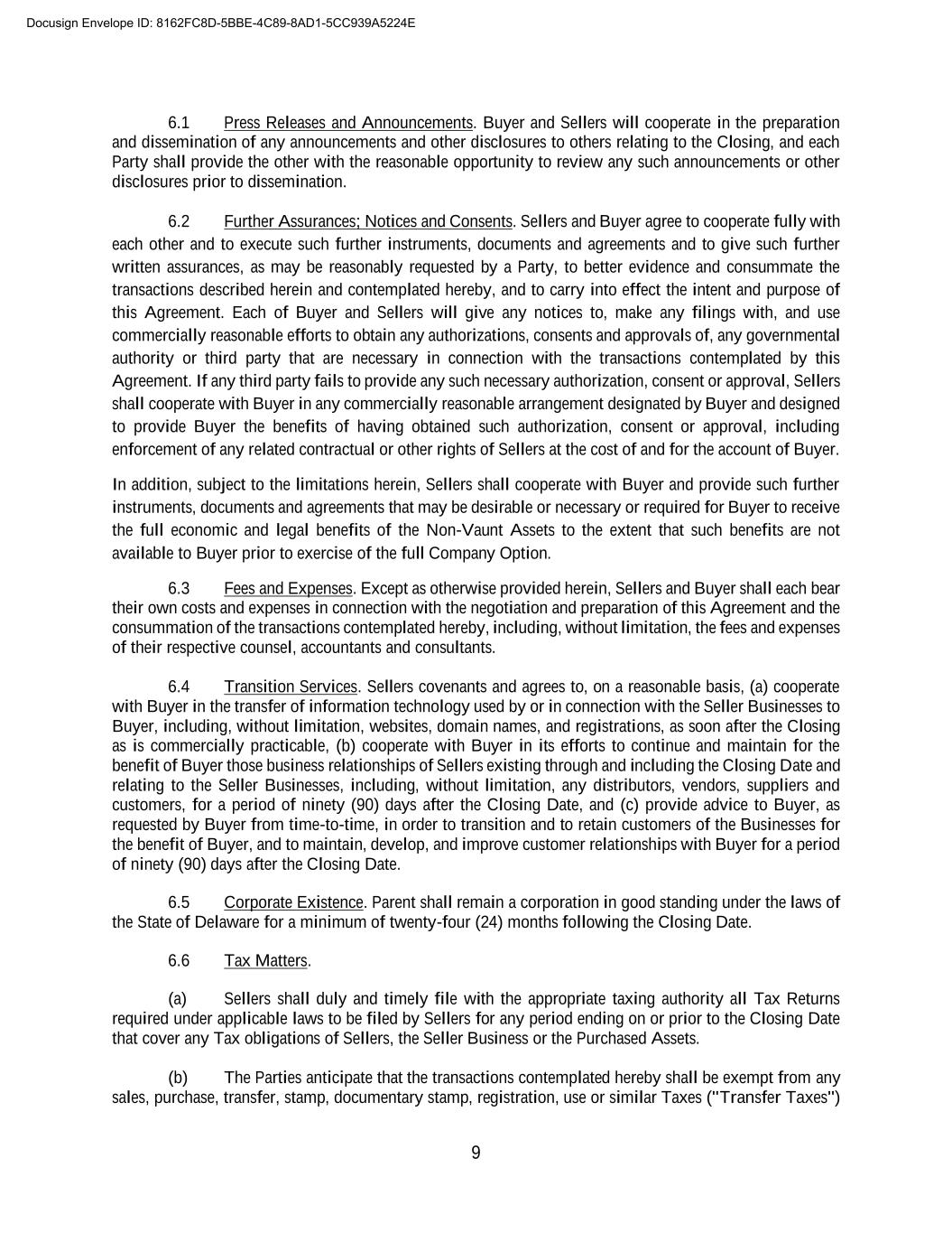 9 6.1 Press Releases and Announcements. Buyer and Sellers will cooperate in the preparation and dissemination of any announcements and other disclosures to others relating to the Closing, and each Party shall provide the other with the reasonable opportunity to review any such announcements or other disclosures prior to dissemination. 6.2 Further Assurances; Notices and Consents. Sellers and Buyer agree to cooperate fully with each other and to execute such further instruments, documents and agreements and to give such further written assurances, as may be reasonably requested by a Party, to better evidence and consummate the transactions described herein and contemplated hereby, and to carry into effect the intent and purpose of this Agreement. Each of Buyer and Sellers will give any notices to, make any filings with, and use commercially reasonable efforts to obtain any authorizations, consents and approvals of, any governmental authority or third party that are necessary in connection with the transactions contemplated by this Agreement. If any third party fails to provide any such necessary authorization, consent or approval, Sellers shall cooperate with Buyer in any commercially reasonable arrangement designated by Buyer and designed to provide Buyer the benefits of having obtained such authorization, consent or approval, including enforcement of any related contractual or other rights of Sellers at the cost of and for the account of Buyer. In addition, subject to the limitations herein, Sellers shall cooperate with Buyer and provide such further instruments, documents and agreements that may be desirable or necessary or required for Buyer to receive the full economic and legal benefits of the Non-Vaunt Assets to the extent that such benefits are not available to Buyer prior to exercise of the full Company Option. 6.3 Fees and Expenses. Except as otherwise provided herein, Sellers and Buyer shall each bear their own costs and expenses in connection with the negotiation and preparation of this Agreement and the consummation of the transactions contemplated hereby, including, without limitation, the fees and expenses of their respective counsel, accountants and consultants. 6.4 Transition Services. Sellers covenants and agrees to, on a reasonable basis, (a) cooperate with Buyer in the transfer of information technology used by or in connection with the Seller Businesses to Buyer, including, without limitation, websites, domain names, and registrations, as soon after the Closing as is commercially practicable, (b) cooperate with Buyer in its efforts to continue and maintain for the benefit of Buyer those business relationships of Sellers existing through and including the Closing Date and relating to the Seller Businesses, including, without limitation, any distributors, vendors, suppliers and customers, for a period of ninety (90) days after the Closing Date, and (c) provide advice to Buyer, as requested by Buyer from time-to-time, in order to transition and to retain customers of the Businesses for the benefit of Buyer, and to maintain, develop, and improve customer relationships with Buyer for a period of ninety (90) days after the Closing Date. 6.5 Corporate Existence. Parent shall remain a corporation in good standing under the laws of the State of Delaware for a minimum of twenty-four (24) months following the Closing Date. 6.6 Tax Matters. (a) Sellers shall duly and timely file with the appropriate taxing authority all Tax Returns required under applicable laws to be filed by Sellers for any period ending on or prior to the Closing Date that cover any Tax obligations of Sellers, the Seller Business or the Purchased Assets. (b) The Parties anticipate that the transactions contemplated hereby shall be exempt from any sales, purchase, transfer, stamp, documentary stamp, registration, use or similar Taxes ("Transfer Taxes") Docusign Envelope ID: 8162FC8D-5BBE-4C89-8AD1-5CC939A5224E