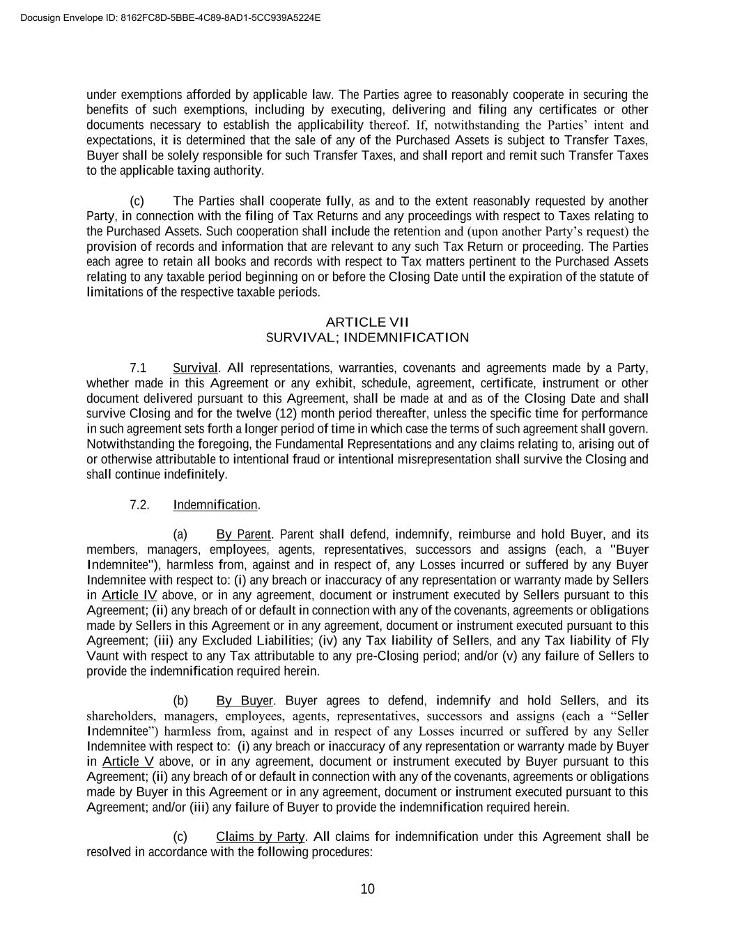 10 under exemptions afforded by applicable law. The Parties agree to reasonably cooperate in securing the benefits of such exemptions, including by executing, delivering and filing any certificates or other documents necessary to establish the applicability thereof. If, notwithstanding the Parties’ intent and expectations, it is determined that the sale of any of the Purchased Assets is subject to Transfer Taxes, Buyer shall be solely responsible for such Transfer Taxes, and shall report and remit such Transfer Taxes to the applicable taxing authority. (c) The Parties shall cooperate fully, as and to the extent reasonably requested by another Party, in connection with the filing of Tax Returns and any proceedings with respect to Taxes relating to the Purchased Assets. Such cooperation shall include the retention and (upon another Party’s request) the provision of records and information that are relevant to any such Tax Return or proceeding. The Parties each agree to retain all books and records with respect to Tax matters pertinent to the Purchased Assets relating to any taxable period beginning on or before the Closing Date until the expiration of the statute of limitations of the respective taxable periods. ARTICLE VII SURVIVAL; INDEMNIFICATION 7.1 Survival. All representations, warranties, covenants and agreements made by a Party, whether made in this Agreement or any exhibit, schedule, agreement, certificate, instrument or other document delivered pursuant to this Agreement, shall be made at and as of the Closing Date and shall survive Closing and for the twelve (12) month period thereafter, unless the specific time for performance in such agreement sets forth a longer period of time in which case the terms of such agreement shall govern. Notwithstanding the foregoing, the Fundamental Representations and any claims relating to, arising out of or otherwise attributable to intentional fraud or intentional misrepresentation shall survive the Closing and shall continue indefinitely. 7.2. Indemnification. (a) By Parent. Parent shall defend, indemnify, reimburse and hold Buyer, and its members, managers, employees, agents, representatives, successors and assigns (each, a "Buyer Indemnitee"), harmless from, against and in respect of, any Losses incurred or suffered by any Buyer Indemnitee with respect to: (i) any breach or inaccuracy of any representation or warranty made by Sellers in Article IV above, or in any agreement, document or instrument executed by Sellers pursuant to this Agreement; (ii) any breach of or default in connection with any of the covenants, agreements or obligations made by Sellers in this Agreement or in any agreement, document or instrument executed pursuant to this Agreement; (iii) any Excluded Liabilities; (iv) any Tax liability of Sellers, and any Tax liability of Fly Vaunt with respect to any Tax attributable to any pre-Closing period; and/or (v) any failure of Sellers to provide the indemnification required herein. (b) By Buyer. Buyer agrees to defend, indemnify and hold Sellers, and its shareholders, managers, employees, agents, representatives, successors and assigns (each a “Seller Indemnitee”) harmless from, against and in respect of any Losses incurred or suffered by any Seller Indemnitee with respect to: (i) any breach or inaccuracy of any representation or warranty made by Buyer in Article V above, or in any agreement, document or instrument executed by Buyer pursuant to this Agreement; (ii) any breach of or default in connection with any of the covenants, agreements or obligations made by Buyer in this Agreement or in any agreement, document or instrument executed pursuant to this Agreement; and/or (iii) any failure of Buyer to provide the indemnification required herein. (c) Claims by Party. All claims for indemnification under this Agreement shall be resolved in accordance with the following procedures: Docusign Envelope ID: 8162FC8D-5BBE-4C89-8AD1-5CC939A5224E