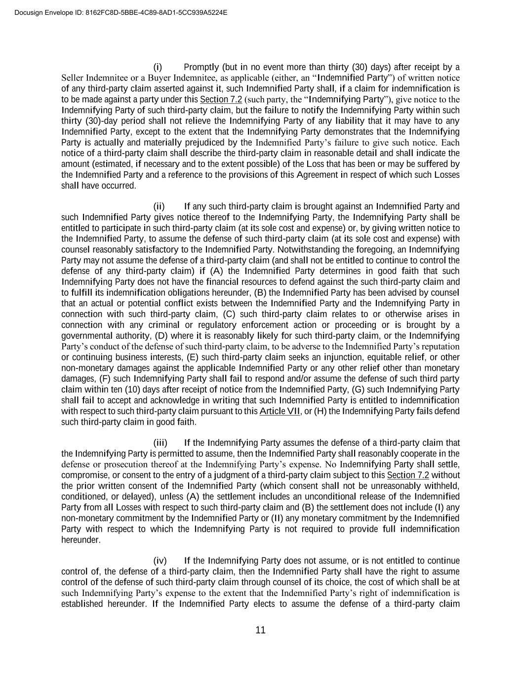 11 (i) Promptly (but in no event more than thirty (30) days) after receipt by a Seller Indemnitee or a Buyer Indemnitee, as applicable (either, an “Indemnified Party”) of written notice of any third-party claim asserted against it, such Indemnified Party shall, if a claim for indemnification is to be made against a party under this Section 7.2 (such party, the “Indemnifying Party”), give notice to the Indemnifying Party of such third-party claim, but the failure to notify the Indemnifying Party within such thirty (30)-day period shall not relieve the Indemnifying Party of any liability that it may have to any Indemnified Party, except to the extent that the Indemnifying Party demonstrates that the Indemnifying Party is actually and materially prejudiced by the Indemnified Party’s failure to give such notice. Each notice of a third-party claim shall describe the third-party claim in reasonable detail and shall indicate the amount (estimated, if necessary and to the extent possible) of the Loss that has been or may be suffered by the Indemnified Party and a reference to the provisions of this Agreement in respect of which such Losses shall have occurred. (ii) If any such third-party claim is brought against an Indemnified Party and such Indemnified Party gives notice thereof to the Indemnifying Party, the Indemnifying Party shall be entitled to participate in such third-party claim (at its sole cost and expense) or, by giving written notice to the Indemnified Party, to assume the defense of such third-party claim (at its sole cost and expense) with counsel reasonably satisfactory to the Indemnified Party. Notwithstanding the foregoing, an Indemnifying Party may not assume the defense of a third-party claim (and shall not be entitled to continue to control the defense of any third-party claim) if (A) the Indemnified Party determines in good faith that such Indemnifying Party does not have the financial resources to defend against the such third-party claim and to fulfill its indemnification obligations hereunder, (B) the Indemnified Party has been advised by counsel that an actual or potential conflict exists between the Indemnified Party and the Indemnifying Party in connection with such third-party claim, (C) such third-party claim relates to or otherwise arises in connection with any criminal or regulatory enforcement action or proceeding or is brought by a governmental authority, (D) where it is reasonably likely for such third-party claim, or the Indemnifying Party’s conduct of the defense of such third-party claim, to be adverse to the Indemnified Party’s reputation or continuing business interests, (E) such third-party claim seeks an injunction, equitable relief, or other non-monetary damages against the applicable Indemnified Party or any other relief other than monetary damages, (F) such Indemnifying Party shall fail to respond and/or assume the defense of such third party claim within ten (10) days after receipt of notice from the Indemnified Party, (G) such Indemnifying Party shall fail to accept and acknowledge in writing that such Indemnified Party is entitled to indemnification with respect to such third-party claim pursuant to this Article VII, or (H) the Indemnifying Party fails defend such third-party claim in good faith. (iii) If the Indemnifying Party assumes the defense of a third-party claim that the Indemnifying Party is permitted to assume, then the Indemnified Party shall reasonably cooperate in the defense or prosecution thereof at the Indemnifying Party’s expense. No Indemnifying Party shall settle, compromise, or consent to the entry of a judgment of a third-party claim subject to this Section 7.2 without the prior written consent of the Indemnified Party (which consent shall not be unreasonably withheld, conditioned, or delayed), unless (A) the settlement includes an unconditional release of the Indemnified Party from all Losses with respect to such third-party claim and (B) the settlement does not include (I) any non-monetary commitment by the Indemnified Party or (II) any monetary commitment by the Indemnified Party with respect to which the Indemnifying Party is not required to provide full indemnification hereunder. (iv) If the Indemnifying Party does not assume, or is not entitled to continue control of, the defense of a third-party claim, then the Indemnified Party shall have the right to assume control of the defense of such third-party claim through counsel of its choice, the cost of which shall be at such Indemnifying Party’s expense to the extent that the Indemnified Party’s right of indemnification is established hereunder. If the Indemnified Party elects to assume the defense of a third-party claim Docusign Envelope ID: 8162FC8D-5BBE-4C89-8AD1-5CC939A5224E