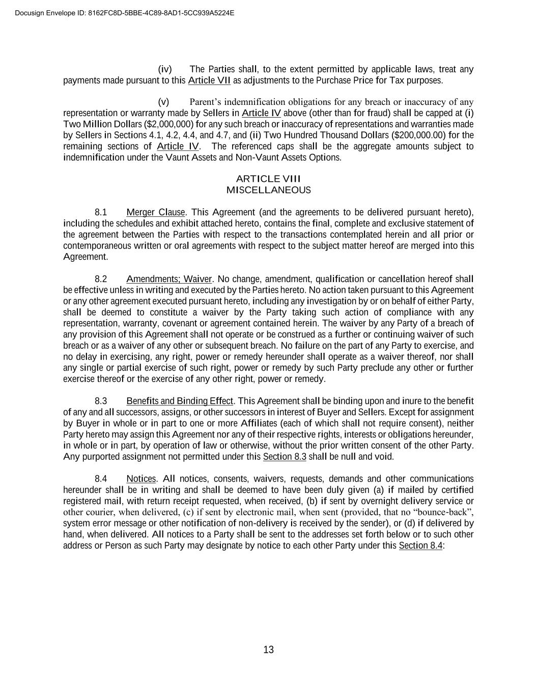 13 (iv) The Parties shall, to the extent permitted by applicable laws, treat any payments made pursuant to this Article VII as adjustments to the Purchase Price for Tax purposes. (v) Parent’s indemnification obligations for any breach or inaccuracy of any representation or warranty made by Sellers in Article IV above (other than for fraud) shall be capped at (i) Two Million Dollars ($2,000,000) for any such breach or inaccuracy of representations and warranties made by Sellers in Sections 4.1, 4.2, 4.4, and 4.7, and (ii) Two Hundred Thousand Dollars ($200,000.00) for the remaining sections of Article IV. The referenced caps shall be the aggregate amounts subject to indemnification under the Vaunt Assets and Non-Vaunt Assets Options. ARTICLE VIII MISCELLANEOUS 8.1 Merger Clause. This Agreement (and the agreements to be delivered pursuant hereto), including the schedules and exhibit attached hereto, contains the final, complete and exclusive statement of the agreement between the Parties with respect to the transactions contemplated herein and all prior or contemporaneous written or oral agreements with respect to the subject matter hereof are merged into this Agreement. 8.2 Amendments; Waiver. No change, amendment, qualification or cancellation hereof shall be effective unless in writing and executed by the Parties hereto. No action taken pursuant to this Agreement or any other agreement executed pursuant hereto, including any investigation by or on behalf of either Party, shall be deemed to constitute a waiver by the Party taking such action of compliance with any representation, warranty, covenant or agreement contained herein. The waiver by any Party of a breach of any provision of this Agreement shall not operate or be construed as a further or continuing waiver of such breach or as a waiver of any other or subsequent breach. No failure on the part of any Party to exercise, and no delay in exercising, any right, power or remedy hereunder shall operate as a waiver thereof, nor shall any single or partial exercise of such right, power or remedy by such Party preclude any other or further exercise thereof or the exercise of any other right, power or remedy. 8.3 Benefits and Binding Effect. This Agreement shall be binding upon and inure to the benefit of any and all successors, assigns, or other successors in interest of Buyer and Sellers. Except for assignment by Buyer in whole or in part to one or more Affiliates (each of which shall not require consent), neither Party hereto may assign this Agreement nor any of their respective rights, interests or obligations hereunder, in whole or in part, by operation of law or otherwise, without the prior written consent of the other Party. Any purported assignment not permitted under this Section 8.3 shall be null and void. 8.4 Notices. All notices, consents, waivers, requests, demands and other communications hereunder shall be in writing and shall be deemed to have been duly given (a) if mailed by certified registered mail, with return receipt requested, when received, (b) if sent by overnight delivery service or other courier, when delivered, (c) if sent by electronic mail, when sent (provided, that no “bounce-back”, system error message or other notification of non-delivery is received by the sender), or (d) if delivered by hand, when delivered. All notices to a Party shall be sent to the addresses set forth below or to such other address or Person as such Party may designate by notice to each other Party under this Section 8.4: Docusign Envelope ID: 8162FC8D-5BBE-4C89-8AD1-5CC939A5224E