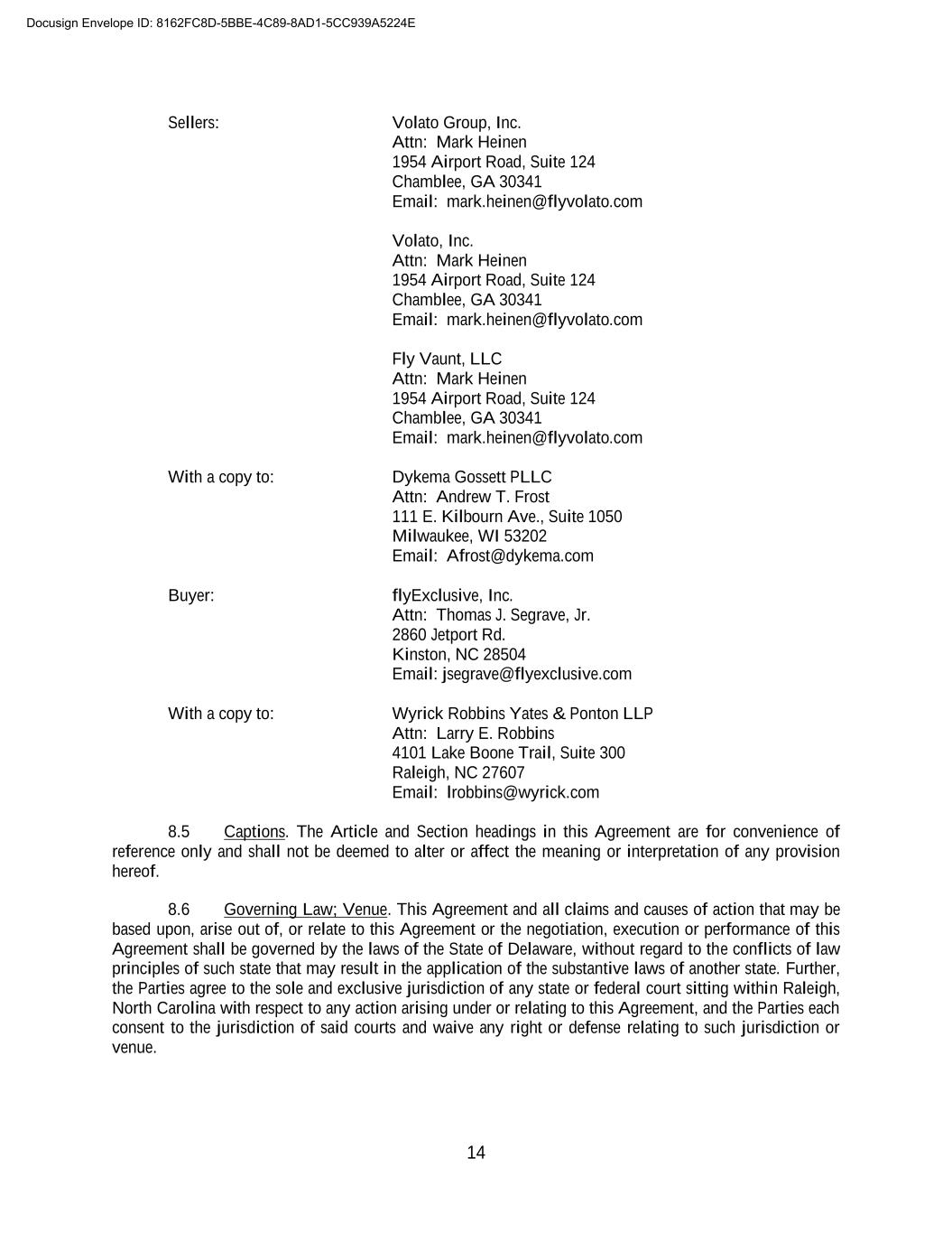 14 Sellers: Volato Group, Inc. Attn: Mark Heinen 1954 Airport Road, Suite 124 Chamblee, GA 30341 Email: mark.heinen@flyvolato.com Volato, Inc. Attn: Mark Heinen 1954 Airport Road, Suite 124 Chamblee, GA 30341 Email: mark.heinen@flyvolato.com Fly Vaunt, LLC Attn: Mark Heinen 1954 Airport Road, Suite 124 Chamblee, GA 30341 Email: mark.heinen@flyvolato.com With a copy to: Dykema Gossett PLLC Attn: Andrew T. Frost 111 E. Kilbourn Ave., Suite 1050 Milwaukee, WI 53202 Email: Afrost@dykema.com Buyer: flyExclusive, Inc. Attn: Thomas J. Segrave, Jr. 2860 Jetport Rd. Kinston, NC 28504 Email: jsegrave@flyexclusive.com With a copy to: Wyrick Robbins Yates & Ponton LLP Attn: Larry E. Robbins 4101 Lake Boone Trail, Suite 300 Raleigh, NC 27607 Email: lrobbins@wyrick.com 8.5 Captions. The Article and Section headings in this Agreement are for convenience of reference only and shall not be deemed to alter or affect the meaning or interpretation of any provision hereof. 8.6 Governing Law; Venue. This Agreement and all claims and causes of action that may be based upon, arise out of, or relate to this Agreement or the negotiation, execution or performance of this Agreement shall be governed by the laws of the State of Delaware, without regard to the conflicts of law principles of such state that may result in the application of the substantive laws of another state. Further, the Parties agree to the sole and exclusive jurisdiction of any state or federal court sitting within Raleigh, North Carolina with respect to any action arising under or relating to this Agreement, and the Parties each consent to the jurisdiction of said courts and waive any right or defense relating to such jurisdiction or venue. Docusign Envelope ID: 8162FC8D-5BBE-4C89-8AD1-5CC939A5224E