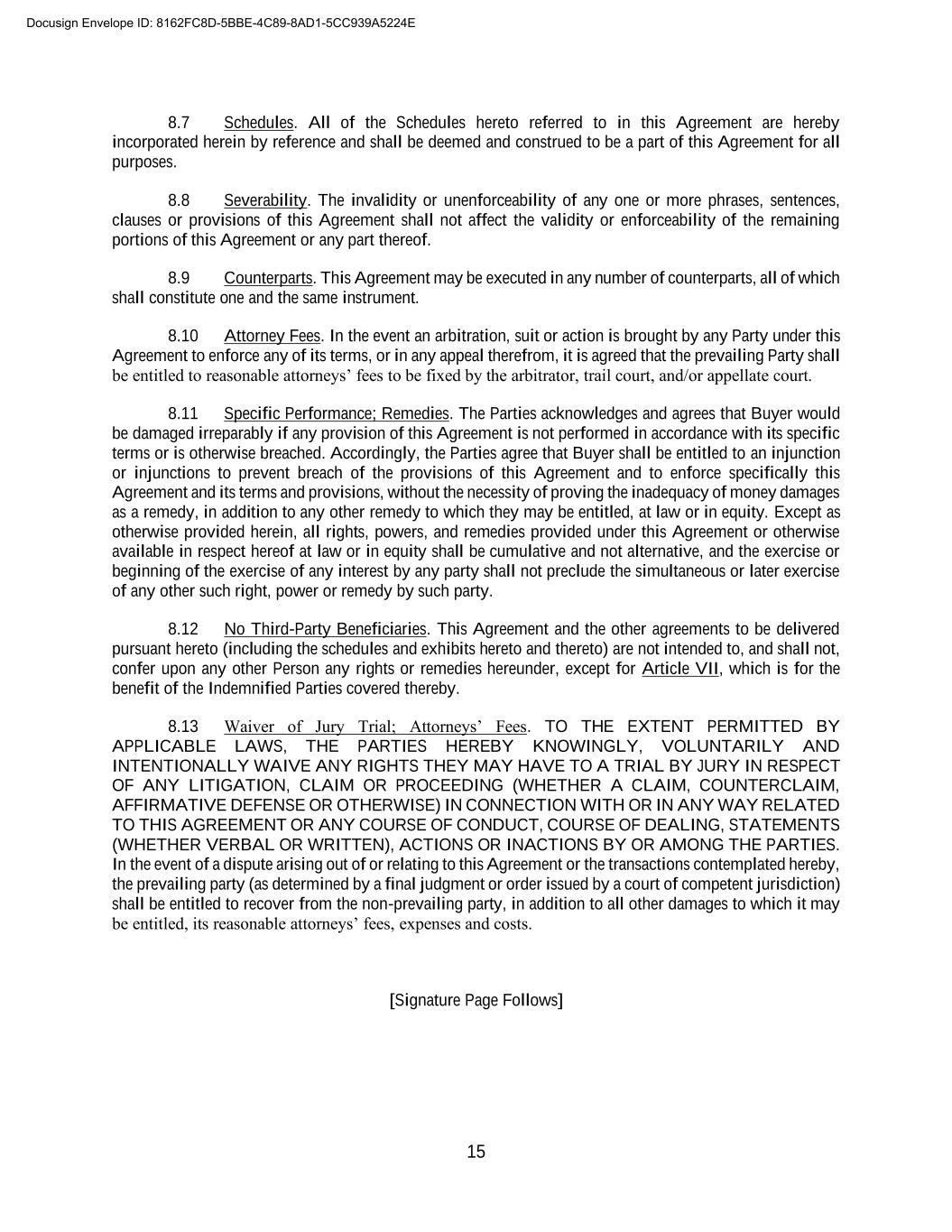 15 8.7 Schedules. All of the Schedules hereto referred to in this Agreement are hereby incorporated herein by reference and shall be deemed and construed to be a part of this Agreement for all purposes. 8.8 Severability. The invalidity or unenforceability of any one or more phrases, sentences, clauses or provisions of this Agreement shall not affect the validity or enforceability of the remaining portions of this Agreement or any part thereof. 8.9 Counterparts. This Agreement may be executed in any number of counterparts, all of which shall constitute one and the same instrument. 8.10 Attorney Fees. In the event an arbitration, suit or action is brought by any Party under this Agreement to enforce any of its terms, or in any appeal therefrom, it is agreed that the prevailing Party shall be entitled to reasonable attorneys’ fees to be fixed by the arbitrator, trail court, and/or appellate court. 8.11 Specific Performance; Remedies. The Parties acknowledges and agrees that Buyer would be damaged irreparably if any provision of this Agreement is not performed in accordance with its specific terms or is otherwise breached. Accordingly, the Parties agree that Buyer shall be entitled to an injunction or injunctions to prevent breach of the provisions of this Agreement and to enforce specifically this Agreement and its terms and provisions, without the necessity of proving the inadequacy of money damages as a remedy, in addition to any other remedy to which they may be entitled, at law or in equity. Except as otherwise provided herein, all rights, powers, and remedies provided under this Agreement or otherwise available in respect hereof at law or in equity shall be cumulative and not alternative, and the exercise or beginning of the exercise of any interest by any party shall not preclude the simultaneous or later exercise of any other such right, power or remedy by such party. 8.12 No Third-Party Beneficiaries. This Agreement and the other agreements to be delivered pursuant hereto (including the schedules and exhibits hereto and thereto) are not intended to, and shall not, confer upon any other Person any rights or remedies hereunder, except for Article VII, which is for the benefit of the Indemnified Parties covered thereby. 8.13 Waiver of Jury Trial; Attorneys’ Fees. TO THE EXTENT PERMITTED BY APPLICABLE LAWS, THE PARTIES HEREBY KNOWINGLY, VOLUNTARILY AND INTENTIONALLY WAIVE ANY RIGHTS THEY MAY HAVE TO A TRIAL BY JURY IN RESPECT OF ANY LITIGATION, CLAIM OR PROCEEDING (WHETHER A CLAIM, COUNTERCLAIM, AFFIRMATIVE DEFENSE OR OTHERWISE) IN CONNECTION WITH OR IN ANY WAY RELATED TO THIS AGREEMENT OR ANY COURSE OF CONDUCT, COURSE OF DEALING, STATEMENTS (WHETHER VERBAL OR WRITTEN), ACTIONS OR INACTIONS BY OR AMONG THE PARTIES. In the event of a dispute arising out of or relating to this Agreement or the transactions contemplated hereby, the prevailing party (as determined by a final judgment or order issued by a court of competent jurisdiction) shall be entitled to recover from the non-prevailing party, in addition to all other damages to which it may be entitled, its reasonable attorneys’ fees, expenses and costs. [Signature Page Follows] Docusign Envelope ID: 8162FC8D-5BBE-4C89-8AD1-5CC939A5224E