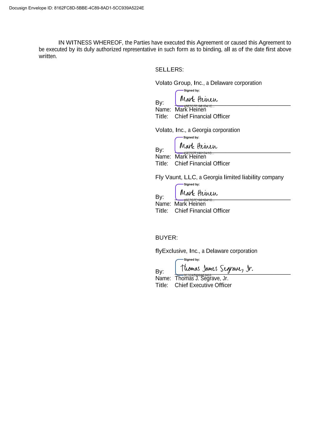 IN WITNESS WHEREOF, the Parties have executed this Agreement or caused this Agreement to be executed by its duly authorized representative in such form as to binding, all as of the date first above written. SELLERS: Volato Group, Inc., a Delaware corporation By: _______________________________________ Name: Mark Heinen Title: Chief Financial Officer Volato, Inc., a Georgia corporation By: _______________________________________ Name: Mark Heinen Title: Chief Financial Officer Fly Vaunt, LLC, a Georgia limited liability company By: _______________________________________ Name: Mark Heinen Title: Chief Financial Officer BUYER: flyExclusive, Inc., a Delaware corporation By: _______________________________________ Name: Thomas J. Segrave, Jr. Title: Chief Executive Officer Docusign Envelope ID: 8162FC8D-5BBE-4C89-8AD1-5CC939A5224E