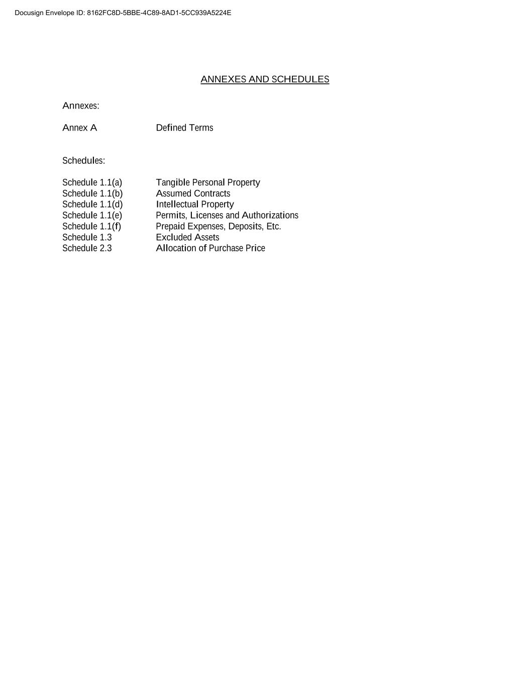 ANNEXES AND SCHEDULES Annexes: Annex A Defined Terms Schedules: Schedule 1.1(a) Tangible Personal Property Schedule 1.1(b) Assumed Contracts Schedule 1.1(d) Intellectual Property Schedule 1.1(e) Permits, Licenses and Authorizations Schedule 1.1(f) Prepaid Expenses, Deposits, Etc. Schedule 1.3 Excluded Assets Schedule 2.3 Allocation of Purchase Price Docusign Envelope ID: 8162FC8D-5BBE-4C89-8AD1-5CC939A5224E