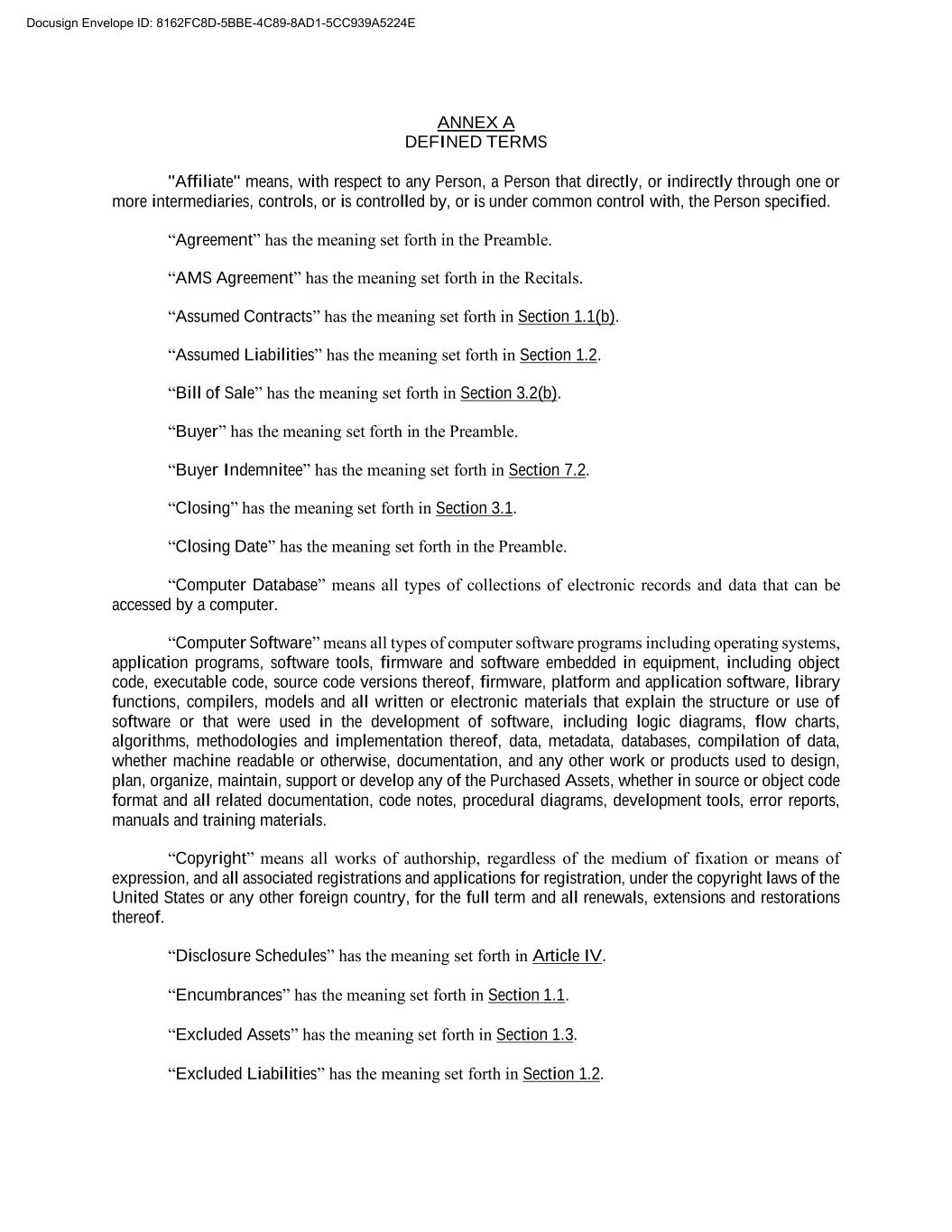 ANNEX A DEFINED TERMS "Affiliate" means, with respect to any Person, a Person that directly, or indirectly through one or more intermediaries, controls, or is controlled by, or is under common control with, the Person specified. “Agreement” has the meaning set forth in the Preamble. “AMS Agreement” has the meaning set forth in the Recitals. “Assumed Contracts” has the meaning set forth in Section 1.1(b). “Assumed Liabilities” has the meaning set forth in Section 1.2. “Bill of Sale” has the meaning set forth in Section 3.2(b). “Buyer” has the meaning set forth in the Preamble. “Buyer Indemnitee” has the meaning set forth in Section 7.2. “Closing” has the meaning set forth in Section 3.1. “Closing Date” has the meaning set forth in the Preamble. “Computer Database” means all types of collections of electronic records and data that can be accessed by a computer. “Computer Software” means all types of computer software programs including operating systems, application programs, software tools, firmware and software embedded in equipment, including object code, executable code, source code versions thereof, firmware, platform and application software, library functions, compilers, models and all written or electronic materials that explain the structure or use of software or that were used in the development of software, including logic diagrams, flow charts, algorithms, methodologies and implementation thereof, data, metadata, databases, compilation of data, whether machine readable or otherwise, documentation, and any other work or products used to design, plan, organize, maintain, support or develop any of the Purchased Assets, whether in source or object code format and all related documentation, code notes, procedural diagrams, development tools, error reports, manuals and training materials. “Copyright” means all works of authorship, regardless of the medium of fixation or means of expression, and all associated registrations and applications for registration, under the copyright laws of the United States or any other foreign country, for the full term and all renewals, extensions and restorations thereof. “Disclosure Schedules” has the meaning set forth in Article IV. “Encumbrances” has the meaning set forth in Section 1.1. “Excluded Assets” has the meaning set forth in Section 1.3. “Excluded Liabilities” has the meaning set forth in Section 1.2. Docusign Envelope ID: 8162FC8D-5BBE-4C89-8AD1-5CC939A5224E
