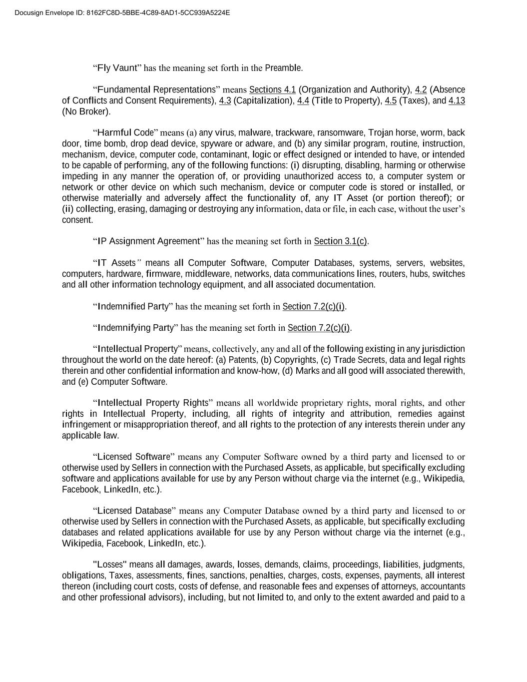 “Fly Vaunt” has the meaning set forth in the Preamble. “Fundamental Representations” means Sections 4.1 (Organization and Authority), 4.2 (Absence of Conflicts and Consent Requirements), 4.3 (Capitalization), 4.4 (Title to Property), 4.5 (Taxes), and 4.13 (No Broker). “Harmful Code” means (a) any virus, malware, trackware, ransomware, Trojan horse, worm, back door, time bomb, drop dead device, spyware or adware, and (b) any similar program, routine, instruction, mechanism, device, computer code, contaminant, logic or effect designed or intended to have, or intended to be capable of performing, any of the following functions: (i) disrupting, disabling, harming or otherwise impeding in any manner the operation of, or providing unauthorized access to, a computer system or network or other device on which such mechanism, device or computer code is stored or installed, or otherwise materially and adversely affect the functionality of, any IT Asset (or portion thereof); or (ii) collecting, erasing, damaging or destroying any information, data or file, in each case, without the user’s consent. “IP Assignment Agreement” has the meaning set forth in Section 3.1(c). “IT Assets” means all Computer Software, Computer Databases, systems, servers, websites, computers, hardware, firmware, middleware, networks, data communications lines, routers, hubs, switches and all other information technology equipment, and all associated documentation. “Indemnified Party” has the meaning set forth in Section 7.2(c)(i). “Indemnifying Party” has the meaning set forth in Section 7.2(c)(i). “Intellectual Property” means, collectively, any and all of the following existing in any jurisdiction throughout the world on the date hereof: (a) Patents, (b) Copyrights, (c) Trade Secrets, data and legal rights therein and other confidential information and know-how, (d) Marks and all good will associated therewith, and (e) Computer Software. “Intellectual Property Rights” means all worldwide proprietary rights, moral rights, and other rights in Intellectual Property, including, all rights of integrity and attribution, remedies against infringement or misappropriation thereof, and all rights to the protection of any interests therein under any applicable law. “Licensed Software” means any Computer Software owned by a third party and licensed to or otherwise used by Sellers in connection with the Purchased Assets, as applicable, but specifically excluding software and applications available for use by any Person without charge via the internet (e.g., Wikipedia, Facebook, LinkedIn, etc.). “Licensed Database” means any Computer Database owned by a third party and licensed to or otherwise used by Sellers in connection with the Purchased Assets, as applicable, but specifically excluding databases and related applications available for use by any Person without charge via the internet (e.g., Wikipedia, Facebook, LinkedIn, etc.). "Losses" means all damages, awards, losses, demands, claims, proceedings, liabilities, judgments, obligations, Taxes, assessments, fines, sanctions, penalties, charges, costs, expenses, payments, all interest thereon (including court costs, costs of defense, and reasonable fees and expenses of attorneys, accountants and other professional advisors), including, but not limited to, and only to the extent awarded and paid to a Docusign Envelope ID: 8162FC8D-5BBE-4C89-8AD1-5CC939A5224E
