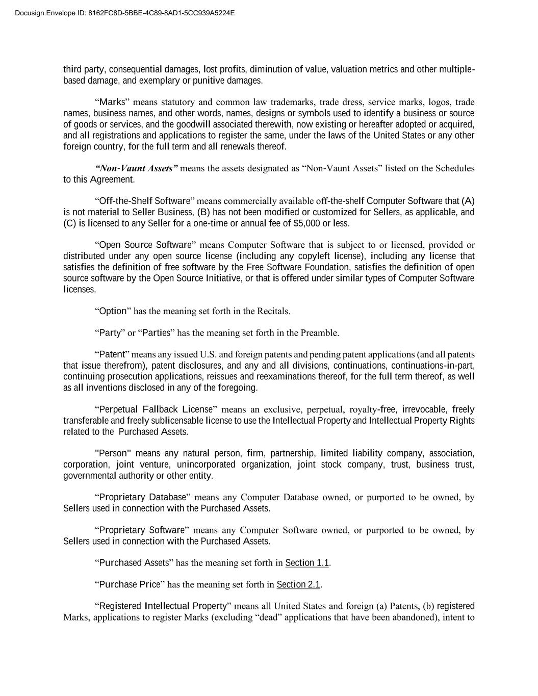 third party, consequential damages, lost profits, diminution of value, valuation metrics and other multiple- based damage, and exemplary or punitive damages. “Marks” means statutory and common law trademarks, trade dress, service marks, logos, trade names, business names, and other words, names, designs or symbols used to identify a business or source of goods or services, and the goodwill associated therewith, now existing or hereafter adopted or acquired, and all registrations and applications to register the same, under the laws of the United States or any other foreign country, for the full term and all renewals thereof. “Non-Vaunt Assets” means the assets designated as “Non-Vaunt Assets” listed on the Schedules to this Agreement. “Off-the-Shelf Software” means commercially available off-the-shelf Computer Software that (A) is not material to Seller Business, (B) has not been modified or customized for Sellers, as applicable, and (C) is licensed to any Seller for a one-time or annual fee of $5,000 or less. “Open Source Software” means Computer Software that is subject to or licensed, provided or distributed under any open source license (including any copyleft license), including any license that satisfies the definition of free software by the Free Software Foundation, satisfies the definition of open source software by the Open Source Initiative, or that is offered under similar types of Computer Software licenses. “Option” has the meaning set forth in the Recitals. “Party” or “Parties” has the meaning set forth in the Preamble. “Patent” means any issued U.S. and foreign patents and pending patent applications (and all patents that issue therefrom), patent disclosures, and any and all divisions, continuations, continuations-in-part, continuing prosecution applications, reissues and reexaminations thereof, for the full term thereof, as well as all inventions disclosed in any of the foregoing. “Perpetual Fallback License” means an exclusive, perpetual, royalty-free, irrevocable, freely transferable and freely sublicensable license to use the Intellectual Property and Intellectual Property Rights related to the Purchased Assets. "Person" means any natural person, firm, partnership, limited liability company, association, corporation, joint venture, unincorporated organization, joint stock company, trust, business trust, governmental authority or other entity. “Proprietary Database” means any Computer Database owned, or purported to be owned, by Sellers used in connection with the Purchased Assets. “Proprietary Software” means any Computer Software owned, or purported to be owned, by Sellers used in connection with the Purchased Assets. “Purchased Assets” has the meaning set forth in Section 1.1. “Purchase Price” has the meaning set forth in Section 2.1. “Registered Intellectual Property” means all United States and foreign (a) Patents, (b) registered Marks, applications to register Marks (excluding “dead” applications that have been abandoned), intent to Docusign Envelope ID: 8162FC8D-5BBE-4C89-8AD1-5CC939A5224E