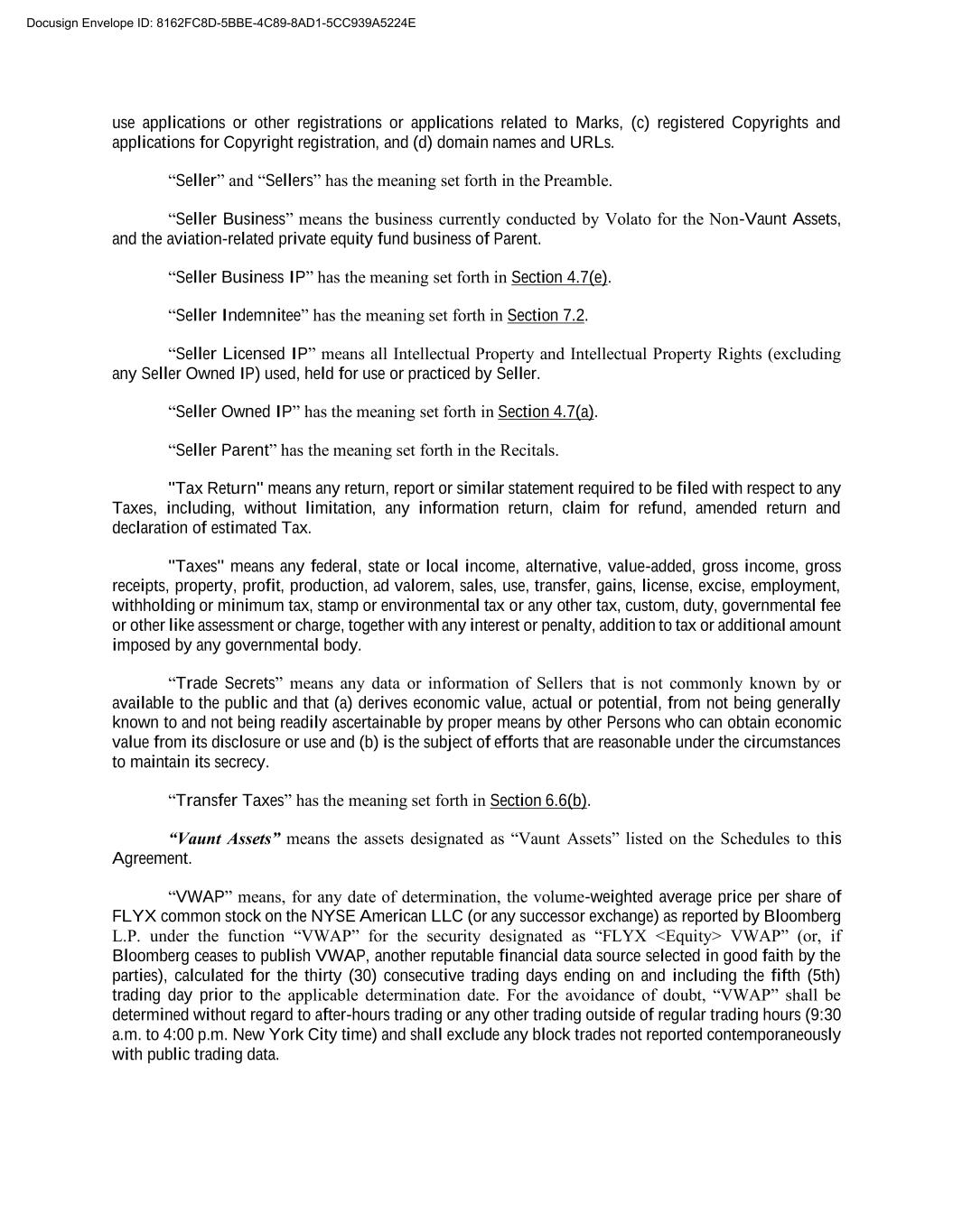 use applications or other registrations or applications related to Marks, (c) registered Copyrights and applications for Copyright registration, and (d) domain names and URLs. “Seller” and “Sellers” has the meaning set forth in the Preamble. “Seller Business” means the business currently conducted by Volato for the Non-Vaunt Assets, and the aviation-related private equity fund business of Parent. “Seller Business IP” has the meaning set forth in Section 4.7(e). “Seller Indemnitee” has the meaning set forth in Section 7.2. “Seller Licensed IP” means all Intellectual Property and Intellectual Property Rights (excluding any Seller Owned IP) used, held for use or practiced by Seller. “Seller Owned IP” has the meaning set forth in Section 4.7(a). “Seller Parent” has the meaning set forth in the Recitals. "Tax Return" means any return, report or similar statement required to be filed with respect to any Taxes, including, without limitation, any information return, claim for refund, amended return and declaration of estimated Tax. "Taxes" means any federal, state or local income, alternative, value-added, gross income, gross receipts, property, profit, production, ad valorem, sales, use, transfer, gains, license, excise, employment, withholding or minimum tax, stamp or environmental tax or any other tax, custom, duty, governmental fee or other like assessment or charge, together with any interest or penalty, addition to tax or additional amount imposed by any governmental body. “Trade Secrets” means any data or information of Sellers that is not commonly known by or available to the public and that (a) derives economic value, actual or potential, from not being generally known to and not being readily ascertainable by proper means by other Persons who can obtain economic value from its disclosure or use and (b) is the subject of efforts that are reasonable under the circumstances to maintain its secrecy. “Transfer Taxes” has the meaning set forth in Section 6.6(b). “Vaunt Assets” means the assets designated as “Vaunt Assets” listed on the Schedules to this Agreement. “VWAP” means, for any date of determination, the volume-weighted average price per share of FLYX common stock on the NYSE American LLC (or any successor exchange) as reported by Bloomberg L.P. under the function “VWAP” for the security designated as “FLYX <Equity> VWAP” (or, if Bloomberg ceases to publish VWAP, another reputable financial data source selected in good faith by the parties), calculated for the thirty (30) consecutive trading days ending on and including the fifth (5th) trading day prior to the applicable determination date. For the avoidance of doubt, “VWAP” shall be determined without regard to after-hours trading or any other trading outside of regular trading hours (9:30 a.m. to 4:00 p.m. New York City time) and shall exclude any block trades not reported contemporaneously with public trading data. Docusign Envelope ID: 8162FC8D-5BBE-4C89-8AD1-5CC939A5224E