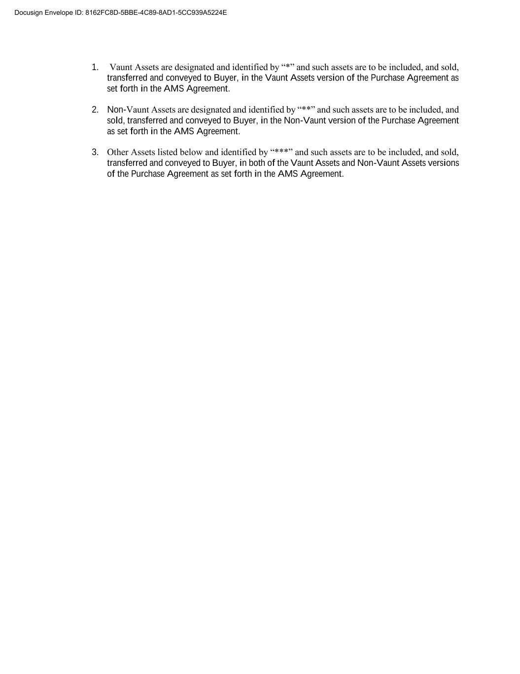 1. Vaunt Assets are designated and identified by “*” and such assets are to be included, and sold, transferred and conveyed to Buyer, in the Vaunt Assets version of the Purchase Agreement as set forth in the AMS Agreement. 2. Non-Vaunt Assets are designated and identified by “**” and such assets are to be included, and sold, transferred and conveyed to Buyer, in the Non-Vaunt version of the Purchase Agreement as set forth in the AMS Agreement. 3. Other Assets listed below and identified by “***” and such assets are to be included, and sold, transferred and conveyed to Buyer, in both of the Vaunt Assets and Non-Vaunt Assets versions of the Purchase Agreement as set forth in the AMS Agreement. Docusign Envelope ID: 8162FC8D-5BBE-4C89-8AD1-5CC939A5224E