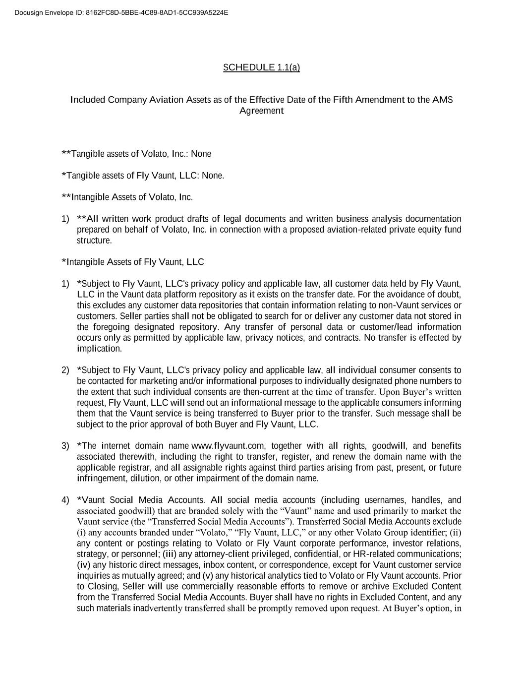 SCHEDULE 1.1(a) Included Company Aviation Assets as of the Effective Date of the Fifth Amendment to the AMS Agreement **Tangible assets of Volato, Inc.: None *Tangible assets of Fly Vaunt, LLC: None. **Intangible Assets of Volato, Inc. 1) **All written work product drafts of legal documents and written business analysis documentation prepared on behalf of Volato, Inc. in connection with a proposed aviation-related private equity fund structure. *Intangible Assets of Fly Vaunt, LLC 1) *Subject to Fly Vaunt, LLC's privacy policy and applicable law, all customer data held by Fly Vaunt, LLC in the Vaunt data platform repository as it exists on the transfer date. For the avoidance of doubt, this excludes any customer data repositories that contain information relating to non-Vaunt services or customers. Seller parties shall not be obligated to search for or deliver any customer data not stored in the foregoing designated repository. Any transfer of personal data or customer/lead information occurs only as permitted by applicable law, privacy notices, and contracts. No transfer is effected by implication. 2) *Subject to Fly Vaunt, LLC's privacy policy and applicable law, all individual consumer consents to be contacted for marketing and/or informational purposes to individually designated phone numbers to the extent that such individual consents are then-current at the time of transfer. Upon Buyer’s written request, Fly Vaunt, LLC will send out an informational message to the applicable consumers informing them that the Vaunt service is being transferred to Buyer prior to the transfer. Such message shall be subject to the prior approval of both Buyer and Fly Vaunt, LLC. 3) *The internet domain name www.flyvaunt.com, together with all rights, goodwill, and benefits associated therewith, including the right to transfer, register, and renew the domain name with the applicable registrar, and all assignable rights against third parties arising from past, present, or future infringement, dilution, or other impairment of the domain name. 4) *Vaunt Social Media Accounts. All social media accounts (including usernames, handles, and associated goodwill) that are branded solely with the “Vaunt” name and used primarily to market the Vaunt service (the “Transferred Social Media Accounts”). Transferred Social Media Accounts exclude (i) any accounts branded under “Volato,” “Fly Vaunt, LLC,” or any other Volato Group identifier; (ii) any content or postings relating to Volato or Fly Vaunt corporate performance, investor relations, strategy, or personnel; (iii) any attorney-client privileged, confidential, or HR-related communications; (iv) any historic direct messages, inbox content, or correspondence, except for Vaunt customer service inquiries as mutually agreed; and (v) any historical analytics tied to Volato or Fly Vaunt accounts. Prior to Closing, Seller will use commercially reasonable efforts to remove or archive Excluded Content from the Transferred Social Media Accounts. Buyer shall have no rights in Excluded Content, and any such materials inadvertently transferred shall be promptly removed upon request. At Buyer’s option, in Docusign Envelope ID: 8162FC8D-5BBE-4C89-8AD1-5CC939A5224E