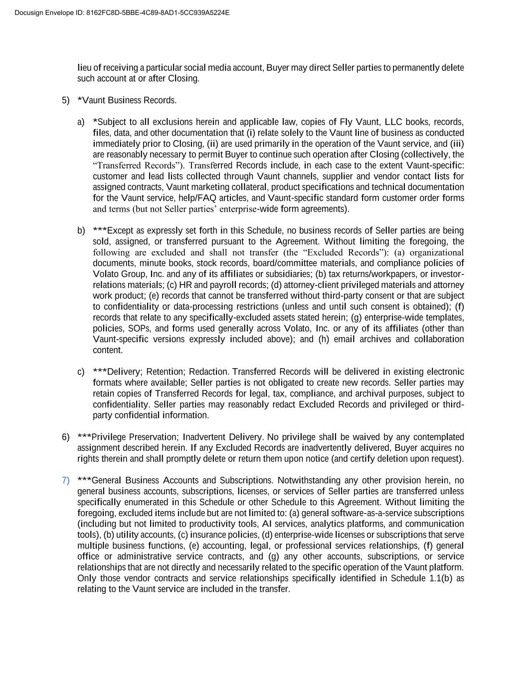 lieu of receiving a particular social media account, Buyer may direct Seller parties to permanently delete such account at or after Closing. 5) *Vaunt Business Records. a) *Subject to all exclusions herein and applicable law, copies of Fly Vaunt, LLC books, records, files, data, and other documentation that (i) relate solely to the Vaunt line of business as conducted immediately prior to Closing, (ii) are used primarily in the operation of the Vaunt service, and (iii) are reasonably necessary to permit Buyer to continue such operation after Closing (collectively, the “Transferred Records”). Transferred Records include, in each case to the extent Vaunt-specific: customer and lead lists collected through Vaunt channels, supplier and vendor contact lists for assigned contracts, Vaunt marketing collateral, product specifications and technical documentation for the Vaunt service, help/FAQ articles, and Vaunt-specific standard form customer order forms and terms (but not Seller parties’ enterprise-wide form agreements). b) ***Except as expressly set forth in this Schedule, no business records of Seller parties are being sold, assigned, or transferred pursuant to the Agreement. Without limiting the foregoing, the following are excluded and shall not transfer (the “Excluded Records”): (a) organizational documents, minute books, stock records, board/committee materials, and compliance policies of Volato Group, Inc. and any of its affiliates or subsidiaries; (b) tax returns/workpapers, or investor- relations materials; (c) HR and payroll records; (d) attorney-client privileged materials and attorney work product; (e) records that cannot be transferred without third-party consent or that are subject to confidentiality or data-processing restrictions (unless and until such consent is obtained); (f) records that relate to any specifically-excluded assets stated herein; (g) enterprise-wide templates, policies, SOPs, and forms used generally across Volato, Inc. or any of its affiliates (other than Vaunt-specific versions expressly included above); and (h) email archives and collaboration content. c) ***Delivery; Retention; Redaction. Transferred Records will be delivered in existing electronic formats where available; Seller parties is not obligated to create new records. Seller parties may retain copies of Transferred Records for legal, tax, compliance, and archival purposes, subject to confidentiality. Seller parties may reasonably redact Excluded Records and privileged or third- party confidential information. 6) ***Privilege Preservation; Inadvertent Delivery. No privilege shall be waived by any contemplated assignment described herein. If any Excluded Records are inadvertently delivered, Buyer acquires no rights therein and shall promptly delete or return them upon notice (and certify deletion upon request). 7) ***General Business Accounts and Subscriptions. Notwithstanding any other provision herein, no general business accounts, subscriptions, licenses, or services of Seller parties are transferred unless specifically enumerated in this Schedule or other Schedule to this Agreement. Without limiting the foregoing, excluded items include but are not limited to: (a) general software-as-a-service subscriptions (including but not limited to productivity tools, AI services, analytics platforms, and communication tools), (b) utility accounts, (c) insurance policies, (d) enterprise-wide licenses or subscriptions that serve multiple business functions, (e) accounting, legal, or professional services relationships, (f) general office or administrative service contracts, and (g) any other accounts, subscriptions, or service relationships that are not directly and necessarily related to the specific operation of the Vaunt platform. Only those vendor contracts and service relationships specifically identified in Schedule 1.1(b) as relating to the Vaunt service are included in the transfer. Docusign Envelope ID: 8162FC8D-5BBE-4C89-8AD1-5CC939A5224E