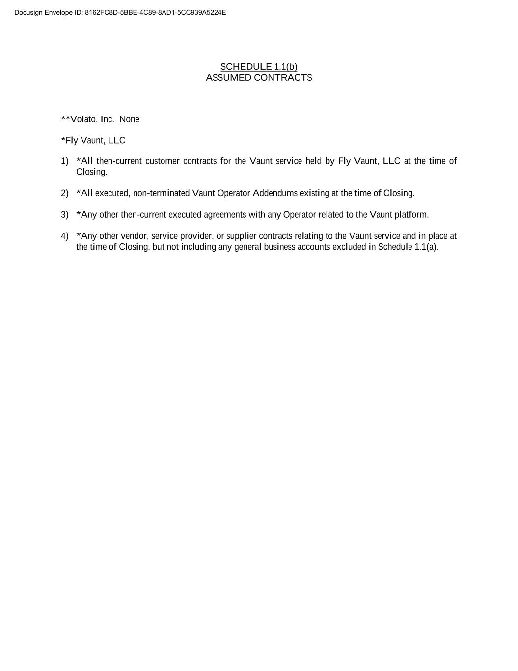 SCHEDULE 1.1(b) ASSUMED CONTRACTS **Volato, Inc. None *Fly Vaunt, LLC 1) *All then-current customer contracts for the Vaunt service held by Fly Vaunt, LLC at the time of Closing. 2) *All executed, non-terminated Vaunt Operator Addendums existing at the time of Closing. 3) *Any other then-current executed agreements with any Operator related to the Vaunt platform. 4) *Any other vendor, service provider, or supplier contracts relating to the Vaunt service and in place at the time of Closing, but not including any general business accounts excluded in Schedule 1.1(a). Docusign Envelope ID: 8162FC8D-5BBE-4C89-8AD1-5CC939A5224E