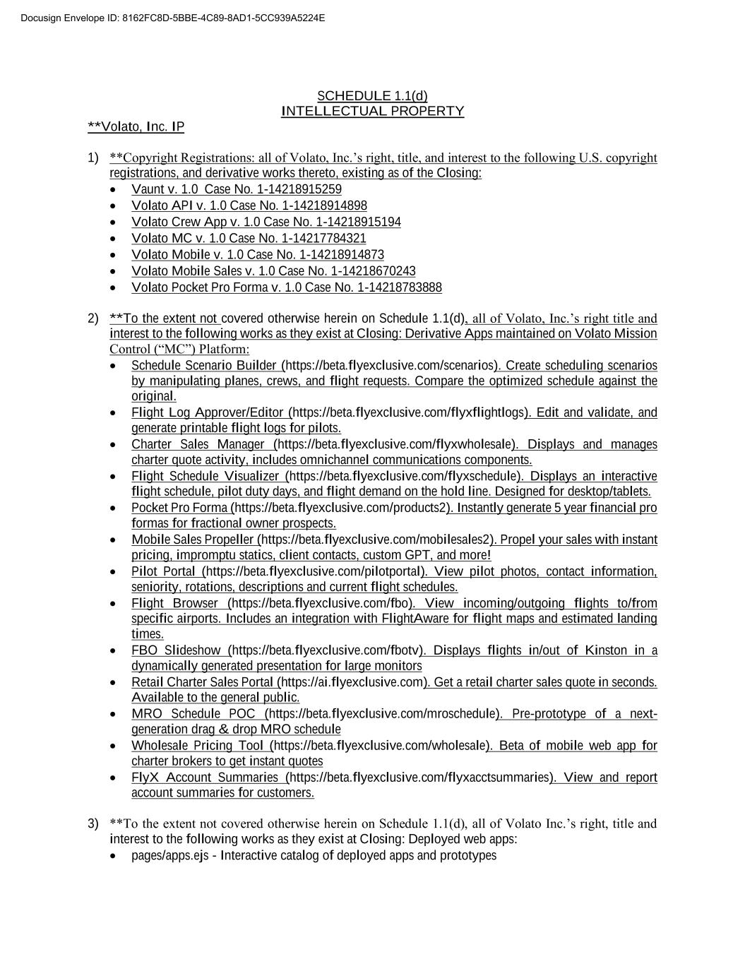 SCHEDULE 1.1(d) INTELLECTUAL PROPERTY **Volato, Inc. IP 1) **Copyright Registrations: all of Volato, Inc.’s right, title, and interest to the following U.S. copyright registrations, and derivative works thereto, existing as of the Closing: • Vaunt v. 1.0 Case No. 1-14218915259 • Volato API v. 1.0 Case No. 1-14218914898 • Volato Crew App v. 1.0 Case No. 1-14218915194 • Volato MC v. 1.0 Case No. 1-14217784321 • Volato Mobile v. 1.0 Case No. 1-14218914873 • Volato Mobile Sales v. 1.0 Case No. 1-14218670243 • Volato Pocket Pro Forma v. 1.0 Case No. 1-14218783888 2) **To the extent not covered otherwise herein on Schedule 1.1(d), all of Volato, Inc.’s right title and interest to the following works as they exist at Closing: Derivative Apps maintained on Volato Mission Control (“MC”) Platform: • Schedule Scenario Builder (https://beta.flyexclusive.com/scenarios). Create scheduling scenarios by manipulating planes, crews, and flight requests. Compare the optimized schedule against the original. • Flight Log Approver/Editor (https://beta.flyexclusive.com/flyxflightlogs). Edit and validate, and generate printable flight logs for pilots. • Charter Sales Manager (https://beta.flyexclusive.com/flyxwholesale). Displays and manages charter quote activity, includes omnichannel communications components. • Flight Schedule Visualizer (https://beta.flyexclusive.com/flyxschedule). Displays an interactive flight schedule, pilot duty days, and flight demand on the hold line. Designed for desktop/tablets. • Pocket Pro Forma (https://beta.flyexclusive.com/products2). Instantly generate 5 year financial pro formas for fractional owner prospects. • Mobile Sales Propeller (https://beta.flyexclusive.com/mobilesales2). Propel your sales with instant pricing, impromptu statics, client contacts, custom GPT, and more! • Pilot Portal (https://beta.flyexclusive.com/pilotportal). View pilot photos, contact information, seniority, rotations, descriptions and current flight schedules. • Flight Browser (https://beta.flyexclusive.com/fbo). View incoming/outgoing flights to/from specific airports. Includes an integration with FlightAware for flight maps and estimated landing times. • FBO Slideshow (https://beta.flyexclusive.com/fbotv). Displays flights in/out of Kinston in a dynamically generated presentation for large monitors • Retail Charter Sales Portal (https://ai.flyexclusive.com). Get a retail charter sales quote in seconds. Available to the general public. • MRO Schedule POC (https://beta.flyexclusive.com/mroschedule). Pre-prototype of a next- generation drag & drop MRO schedule • Wholesale Pricing Tool (https://beta.flyexclusive.com/wholesale). Beta of mobile web app for charter brokers to get instant quotes • FlyX Account Summaries (https://beta.flyexclusive.com/flyxacctsummaries). View and report account summaries for customers. 3) **To the extent not covered otherwise herein on Schedule 1.1(d), all of Volato Inc.’s right, title and interest to the following works as they exist at Closing: Deployed web apps: • pages/apps.ejs - Interactive catalog of deployed apps and prototypes Docusign Envelope ID: 8162FC8D-5BBE-4C89-8AD1-5CC939A5224E