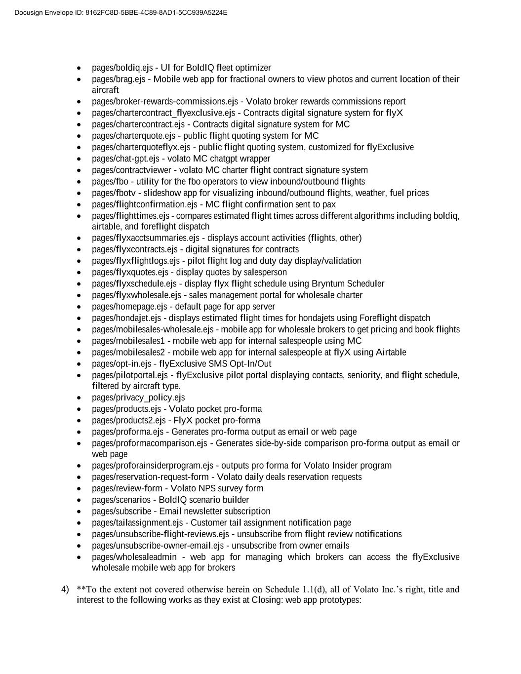 • pages/boldiq.ejs - UI for BoldIQ fleet optimizer • pages/brag.ejs - Mobile web app for fractional owners to view photos and current location of their aircraft • pages/broker-rewards-commissions.ejs - Volato broker rewards commissions report • pages/chartercontract_flyexclusive.ejs - Contracts digital signature system for flyX • pages/chartercontract.ejs - Contracts digital signature system for MC • pages/charterquote.ejs - public flight quoting system for MC • pages/charterquoteflyx.ejs - public flight quoting system, customized for flyExclusive • pages/chat-gpt.ejs - volato MC chatgpt wrapper • pages/contractviewer - volato MC charter flight contract signature system • pages/fbo - utility for the fbo operators to view inbound/outbound flights • pages/fbotv - slideshow app for visualizing inbound/outbound flights, weather, fuel prices • pages/flightconfirmation.ejs - MC flight confirmation sent to pax • pages/flighttimes.ejs - compares estimated flight times across different algorithms including boldiq, airtable, and foreflight dispatch • pages/flyxacctsummaries.ejs - displays account activities (flights, other) • pages/flyxcontracts.ejs - digital signatures for contracts • pages/flyxflightlogs.ejs - pilot flight log and duty day display/validation • pages/flyxquotes.ejs - display quotes by salesperson • pages/flyxschedule.ejs - display flyx flight schedule using Bryntum Scheduler • pages/flyxwholesale.ejs - sales management portal for wholesale charter • pages/homepage.ejs - default page for app server • pages/hondajet.ejs - displays estimated flight times for hondajets using Foreflight dispatch • pages/mobilesales-wholesale.ejs - mobile app for wholesale brokers to get pricing and book flights • pages/mobilesales1 - mobile web app for internal salespeople using MC • pages/mobilesales2 - mobile web app for internal salespeople at flyX using Airtable • pages/opt-in.ejs - flyExclusive SMS Opt-In/Out • pages/pilotportal.ejs - flyExclusive pilot portal displaying contacts, seniority, and flight schedule, filtered by aircraft type. • pages/privacy_policy.ejs • pages/products.ejs - Volato pocket pro-forma • pages/products2.ejs - FlyX pocket pro-forma • pages/proforma.ejs - Generates pro-forma output as email or web page • pages/proformacomparison.ejs - Generates side-by-side comparison pro-forma output as email or web page • pages/proforainsiderprogram.ejs - outputs pro forma for Volato Insider program • pages/reservation-request-form - Volato daily deals reservation requests • pages/review-form - Volato NPS survey form • pages/scenarios - BoldIQ scenario builder • pages/subscribe - Email newsletter subscription • pages/tailassignment.ejs - Customer tail assignment notification page • pages/unsubscribe-flight-reviews.ejs - unsubscribe from flight review notifications • pages/unsubscribe-owner-email.ejs - unsubscribe from owner emails • pages/wholesaleadmin - web app for managing which brokers can access the flyExclusive wholesale mobile web app for brokers 4) **To the extent not covered otherwise herein on Schedule 1.1(d), all of Volato Inc.’s right, title and interest to the following works as they exist at Closing: web app prototypes: Docusign Envelope ID: 8162FC8D-5BBE-4C89-8AD1-5CC939A5224E