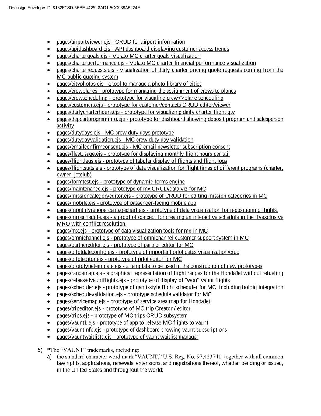 • pages/airportviewer.ejs - CRUD for airport information • pages/apidashboard.ejs - API dashboard displaying customer access trends • pages/chartergoals.ejs - Volato MC charter goals visualization • pages/charterperformance.ejs - Volato MC charter financial performance visualization • pages/charterrequests.ejs - visualization of daily charter pricing quote requests coming from the MC public quoting system • pages/cityphotos.ejs - a tool to manage a photo library of cities • pages/crewplanes - prototype for managing the assignment of crews to planes • pages/crewscheduling - prototype for visualing crew<>plane scheduling • pages/customers.ejs - prototype for customer/contacts CRUD editor/viewer • pages/dailycharterhours.ejs - prototype for visualizing daily charter flight qty • pages/depositprograminfo.ejs - prototype for dashboard showing deposit program and salesperson activity • pages/dutydays.ejs - MC crew duty days prototype • pages/dutydayvalidation.ejs - MC crew duty day validation • pages/emailconfirmconsent.ejs - MC email newsletter subscription consent • pages/fleetusage.ejs - prototype for displaying monthly flight hours per tail • pages/flightlegs.ejs - prototype of tabular display of flights and flight logs • pages/flightstats.ejs - prototype of data visualization for flight times of different programs (charter, owner, jetclub) • pages/formtest.ejs - prototype of dynamic forms engine • pages/maintenance.ejs - prototype of mx CRUD/data viz for MC • pages/missioncategoryeditor.ejs - prototype of CRUD for editing mission categories in MC • pages/mobile.ejs - prototype of passenger-facing mobile app • pages/monthlyrepopercentagechart.ejs - prototype of data visualization for repositioning flights. • pages/mroschedule.ejs - a proof of concept for creating an interactive schedule in the flyexclusive MRO with conflict resolution. • pages/mx.ejs - prototype of data visualization tools for mx in MC • pages/omnichannel.ejs - prototype of omnichannel customer support system in MC • pages/partnereditor.ejs - prototype of partner editor for MC • pages/pilotdateconfig.ejs - prototype of important pilot dates visualization/crud • pages/piloteditor.ejs - prototype of pilot editor for MC • pages/prototypetemplate.ejs - a template to be used in the construction of new prototypes • pages/rangemap.ejs - a graphical representation of flight ranges for the HondaJet without refueling • pages/releasedvauntflights.ejs - prototype of display of "won" vaunt flights • pages/scheduler.ejs - prototype of gantt-style flight scheduler for MC, including boldiq integration • pages/schedulevalidation.ejs - prototype schedule validator for MC • pages/servicemap.ejs - prototype of service area map for HondaJet • pages/tripeditor.ejs - prototype of MC trip Creator / editor • pages/trips.ejs - prototype of MC trips CRUD subsystem • pages/vaunt1.ejs - prototype of app to release MC flights to vaunt • pages/vauntinfo.ejs - prototype of dashboard showing vaunt subscriptions • pages/vauntwaitlists.ejs - prototype of vaunt waitlist manager 5) *The “VAUNT” trademarks, including: a) the standard character word mark “VAUNT,” U.S. Reg. No. 97,423741, together with all common law rights, applications, renewals, extensions, and registrations thereof, whether pending or issued, in the United States and throughout the world; Docusign Envelope ID: 8162FC8D-5BBE-4C89-8AD1-5CC939A5224E
