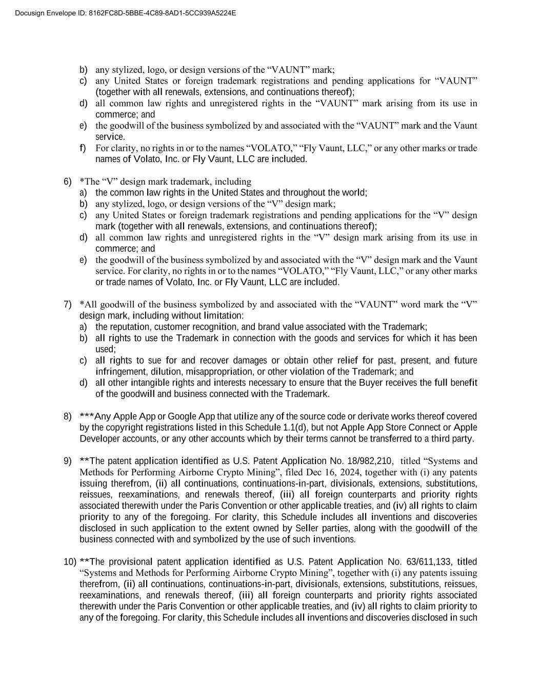b) any stylized, logo, or design versions of the “VAUNT” mark; c) any United States or foreign trademark registrations and pending applications for “VAUNT” (together with all renewals, extensions, and continuations thereof); d) all common law rights and unregistered rights in the “VAUNT” mark arising from its use in commerce; and e) the goodwill of the business symbolized by and associated with the “VAUNT” mark and the Vaunt service. f) For clarity, no rights in or to the names “VOLATO,” “Fly Vaunt, LLC,” or any other marks or trade names of Volato, Inc. or Fly Vaunt, LLC are included. 6) *The “V” design mark trademark, including a) the common law rights in the United States and throughout the world; b) any stylized, logo, or design versions of the “V” design mark; c) any United States or foreign trademark registrations and pending applications for the “V” design mark (together with all renewals, extensions, and continuations thereof); d) all common law rights and unregistered rights in the “V” design mark arising from its use in commerce; and e) the goodwill of the business symbolized by and associated with the “V” design mark and the Vaunt service. For clarity, no rights in or to the names “VOLATO,” “Fly Vaunt, LLC,” or any other marks or trade names of Volato, Inc. or Fly Vaunt, LLC are included. 7) *All goodwill of the business symbolized by and associated with the “VAUNT” word mark the “V” design mark, including without limitation: a) the reputation, customer recognition, and brand value associated with the Trademark; b) all rights to use the Trademark in connection with the goods and services for which it has been used; c) all rights to sue for and recover damages or obtain other relief for past, present, and future infringement, dilution, misappropriation, or other violation of the Trademark; and d) all other intangible rights and interests necessary to ensure that the Buyer receives the full benefit of the goodwill and business connected with the Trademark. 8) ***Any Apple App or Google App that utilize any of the source code or derivate works thereof covered by the copyright registrations listed in this Schedule 1.1(d), but not Apple App Store Connect or Apple Developer accounts, or any other accounts which by their terms cannot be transferred to a third party. 9) **The patent application identified as U.S. Patent Application No. 18/982,210, titled “Systems and Methods for Performing Airborne Crypto Mining”, filed Dec 16, 2024, together with (i) any patents issuing therefrom, (ii) all continuations, continuations-in-part, divisionals, extensions, substitutions, reissues, reexaminations, and renewals thereof, (iii) all foreign counterparts and priority rights associated therewith under the Paris Convention or other applicable treaties, and (iv) all rights to claim priority to any of the foregoing. For clarity, this Schedule includes all inventions and discoveries disclosed in such application to the extent owned by Seller parties, along with the goodwill of the business connected with and symbolized by the use of such inventions. 10) **The provisional patent application identified as U.S. Patent Application No. 63/611,133, titled “Systems and Methods for Performing Airborne Crypto Mining”, together with (i) any patents issuing therefrom, (ii) all continuations, continuations-in-part, divisionals, extensions, substitutions, reissues, reexaminations, and renewals thereof, (iii) all foreign counterparts and priority rights associated therewith under the Paris Convention or other applicable treaties, and (iv) all rights to claim priority to any of the foregoing. For clarity, this Schedule includes all inventions and discoveries disclosed in such Docusign Envelope ID: 8162FC8D-5BBE-4C89-8AD1-5CC939A5224E