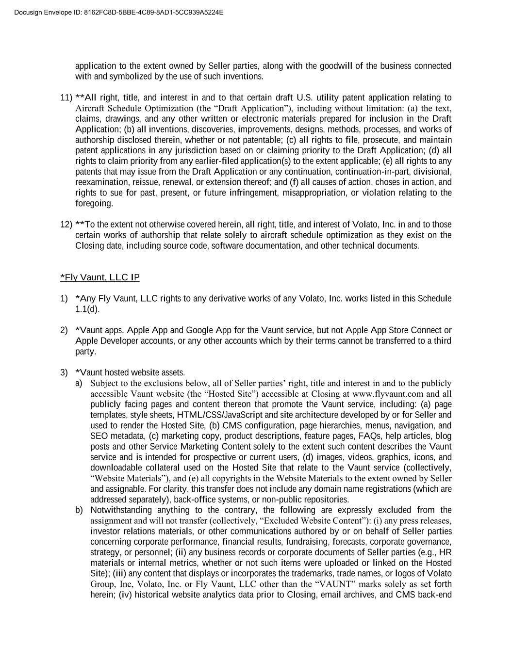 application to the extent owned by Seller parties, along with the goodwill of the business connected with and symbolized by the use of such inventions. 11) **All right, title, and interest in and to that certain draft U.S. utility patent application relating to Aircraft Schedule Optimization (the “Draft Application”), including without limitation: (a) the text, claims, drawings, and any other written or electronic materials prepared for inclusion in the Draft Application; (b) all inventions, discoveries, improvements, designs, methods, processes, and works of authorship disclosed therein, whether or not patentable; (c) all rights to file, prosecute, and maintain patent applications in any jurisdiction based on or claiming priority to the Draft Application; (d) all rights to claim priority from any earlier-filed application(s) to the extent applicable; (e) all rights to any patents that may issue from the Draft Application or any continuation, continuation-in-part, divisional, reexamination, reissue, renewal, or extension thereof; and (f) all causes of action, choses in action, and rights to sue for past, present, or future infringement, misappropriation, or violation relating to the foregoing. 12) **To the extent not otherwise covered herein, all right, title, and interest of Volato, Inc. in and to those certain works of authorship that relate solely to aircraft schedule optimization as they exist on the Closing date, including source code, software documentation, and other technical documents. *Fly Vaunt, LLC IP 1) *Any Fly Vaunt, LLC rights to any derivative works of any Volato, Inc. works listed in this Schedule 1.1(d). 2) *Vaunt apps. Apple App and Google App for the Vaunt service, but not Apple App Store Connect or Apple Developer accounts, or any other accounts which by their terms cannot be transferred to a third party. 3) *Vaunt hosted website assets. a) Subject to the exclusions below, all of Seller parties’ right, title and interest in and to the publicly accessible Vaunt website (the “Hosted Site”) accessible at Closing at www.flyvaunt.com and all publicly facing pages and content thereon that promote the Vaunt service, including: (a) page templates, style sheets, HTML/CSS/JavaScript and site architecture developed by or for Seller and used to render the Hosted Site, (b) CMS configuration, page hierarchies, menus, navigation, and SEO metadata, (c) marketing copy, product descriptions, feature pages, FAQs, help articles, blog posts and other Service Marketing Content solely to the extent such content describes the Vaunt service and is intended for prospective or current users, (d) images, videos, graphics, icons, and downloadable collateral used on the Hosted Site that relate to the Vaunt service (collectively, “Website Materials”), and (e) all copyrights in the Website Materials to the extent owned by Seller and assignable. For clarity, this transfer does not include any domain name registrations (which are addressed separately), back-office systems, or non-public repositories. b) Notwithstanding anything to the contrary, the following are expressly excluded from the assignment and will not transfer (collectively, “Excluded Website Content”): (i) any press releases, investor relations materials, or other communications authored by or on behalf of Seller parties concerning corporate performance, financial results, fundraising, forecasts, corporate governance, strategy, or personnel; (ii) any business records or corporate documents of Seller parties (e.g., HR materials or internal metrics, whether or not such items were uploaded or linked on the Hosted Site); (iii) any content that displays or incorporates the trademarks, trade names, or logos of Volato Group, Inc, Volato, Inc. or Fly Vaunt, LLC other than the “VAUNT” marks solely as set forth herein; (iv) historical website analytics data prior to Closing, email archives, and CMS back-end Docusign Envelope ID: 8162FC8D-5BBE-4C89-8AD1-5CC939A5224E