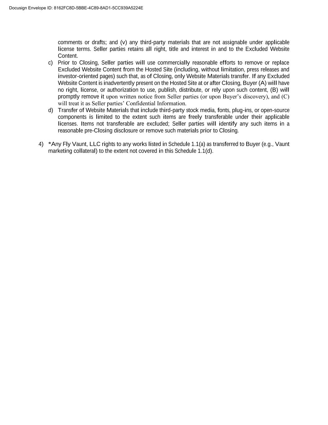 comments or drafts; and (v) any third-party materials that are not assignable under applicable license terms. Seller parties retains all right, title and interest in and to the Excluded Website Content. c) Prior to Closing, Seller parties will use commercially reasonable efforts to remove or replace Excluded Website Content from the Hosted Site (including, without limitation, press releases and investor-oriented pages) such that, as of Closing, only Website Materials transfer. If any Excluded Website Content is inadvertently present on the Hosted Site at or after Closing, Buyer (A) will have no right, license, or authorization to use, publish, distribute, or rely upon such content, (B) will promptly remove it upon written notice from Seller parties (or upon Buyer’s discovery), and (C) will treat it as Seller parties’ Confidential Information. d) Transfer of Website Materials that include third-party stock media, fonts, plug-ins, or open-source components is limited to the extent such items are freely transferable under their applicable licenses. Items not transferable are excluded; Seller parties will identify any such items in a reasonable pre-Closing disclosure or remove such materials prior to Closing. 4) *Any Fly Vaunt, LLC rights to any works listed in Schedule 1.1(a) as transferred to Buyer (e.g., Vaunt marketing collateral) to the extent not covered in this Schedule 1.1(d). Docusign Envelope ID: 8162FC8D-5BBE-4C89-8AD1-5CC939A5224E