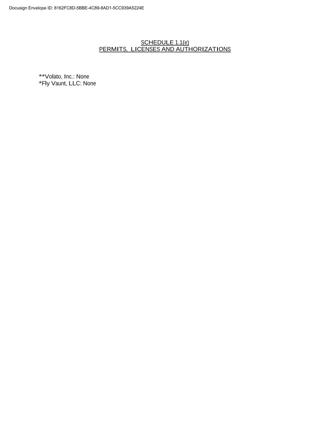 SCHEDULE 1.1(e) PERMITS, LICENSES AND AUTHORIZATIONS **Volato, Inc.: None *Fly Vaunt, LLC: None Docusign Envelope ID: 8162FC8D-5BBE-4C89-8AD1-5CC939A5224E