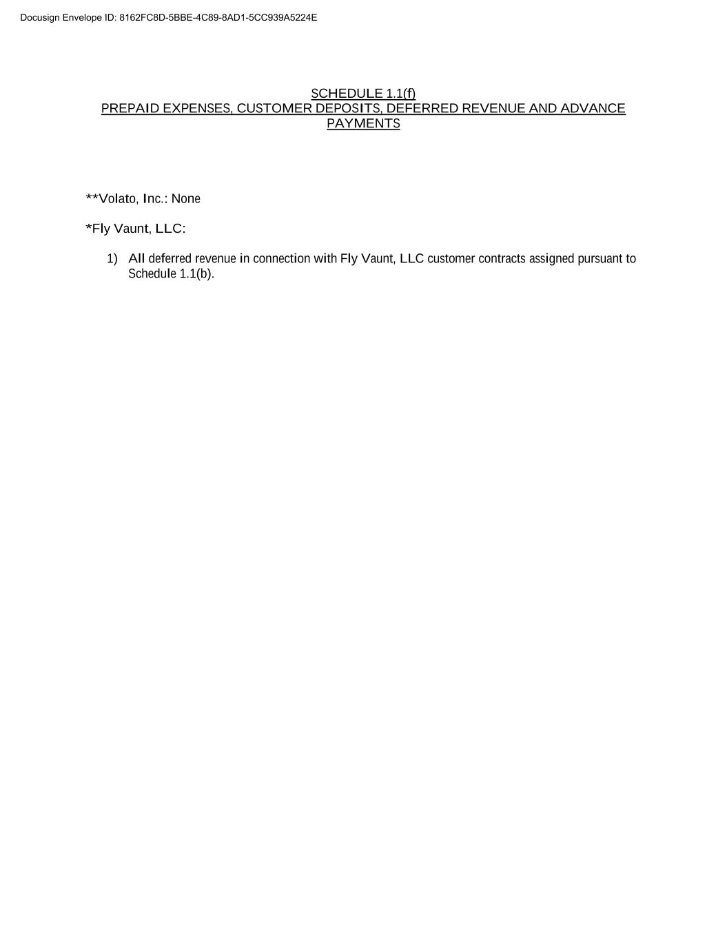 SCHEDULE 1.1(f) PREPAID EXPENSES, CUSTOMER DEPOSITS, DEFERRED REVENUE AND ADVANCE PAYMENTS **Volato, Inc.: None *Fly Vaunt, LLC: 1) All deferred revenue in connection with Fly Vaunt, LLC customer contracts assigned pursuant to Schedule 1.1(b). Docusign Envelope ID: 8162FC8D-5BBE-4C89-8AD1-5CC939A5224E