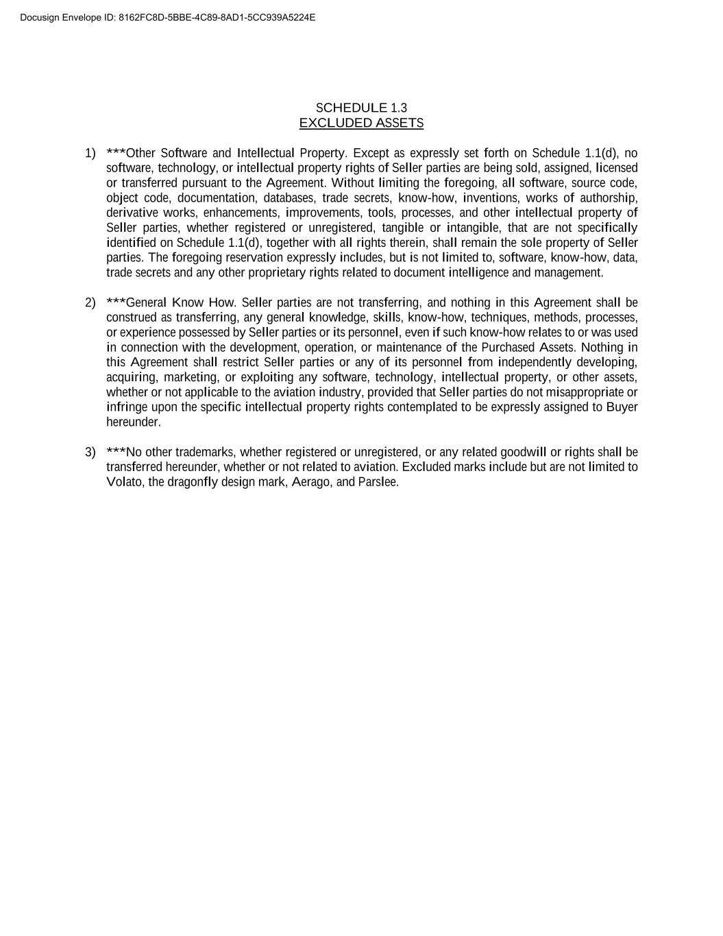 SCHEDULE 1.3 EXCLUDED ASSETS 1) ***Other Software and Intellectual Property. Except as expressly set forth on Schedule 1.1(d), no software, technology, or intellectual property rights of Seller parties are being sold, assigned, licensed or transferred pursuant to the Agreement. Without limiting the foregoing, all software, source code, object code, documentation, databases, trade secrets, know-how, inventions, works of authorship, derivative works, enhancements, improvements, tools, processes, and other intellectual property of Seller parties, whether registered or unregistered, tangible or intangible, that are not specifically identified on Schedule 1.1(d), together with all rights therein, shall remain the sole property of Seller parties. The foregoing reservation expressly includes, but is not limited to, software, know-how, data, trade secrets and any other proprietary rights related to document intelligence and management. 2) ***General Know How. Seller parties are not transferring, and nothing in this Agreement shall be construed as transferring, any general knowledge, skills, know-how, techniques, methods, processes, or experience possessed by Seller parties or its personnel, even if such know-how relates to or was used in connection with the development, operation, or maintenance of the Purchased Assets. Nothing in this Agreement shall restrict Seller parties or any of its personnel from independently developing, acquiring, marketing, or exploiting any software, technology, intellectual property, or other assets, whether or not applicable to the aviation industry, provided that Seller parties do not misappropriate or infringe upon the specific intellectual property rights contemplated to be expressly assigned to Buyer hereunder. 3) ***No other trademarks, whether registered or unregistered, or any related goodwill or rights shall be transferred hereunder, whether or not related to aviation. Excluded marks include but are not limited to Volato, the dragonfly design mark, Aerago, and Parslee. Docusign Envelope ID: 8162FC8D-5BBE-4C89-8AD1-5CC939A5224E