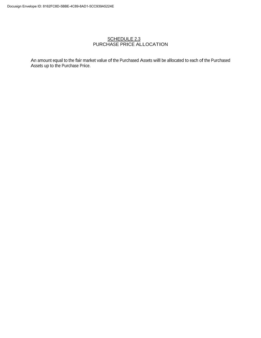 SCHEDULE 2.3 PURCHASE PRICE ALLOCATION An amount equal to the fair market value of the Purchased Assets will be allocated to each of the Purchased Assets up to the Purchase Price. Docusign Envelope ID: 8162FC8D-5BBE-4C89-8AD1-5CC939A5224E